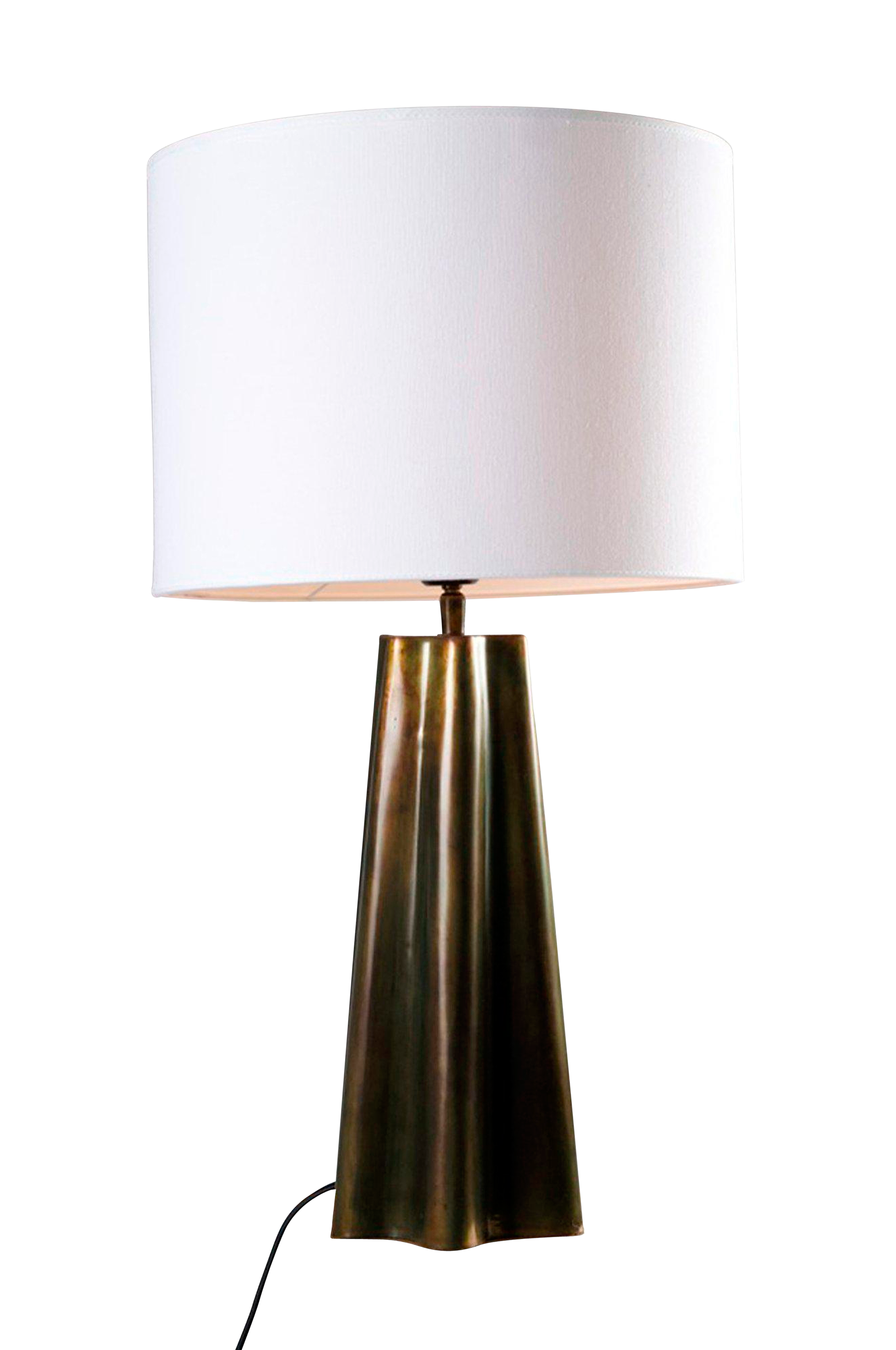 Lampfot aira med cylinderformad skärm. Aira är en lampfot med en organisk vågform i metall där den rustika stilen kombineras med en modern design. Finishen är handgjord och unik för varje exemplar. lampfotens höjd är 44 cm, totalhöjden inklusive skärm är 65 cm och skärmens diameter är 30 cm. 1,5 m svart textilsladd. Justerbart e27-sockel. Max 25w. Ip20. Ljuskälla ingår ej.