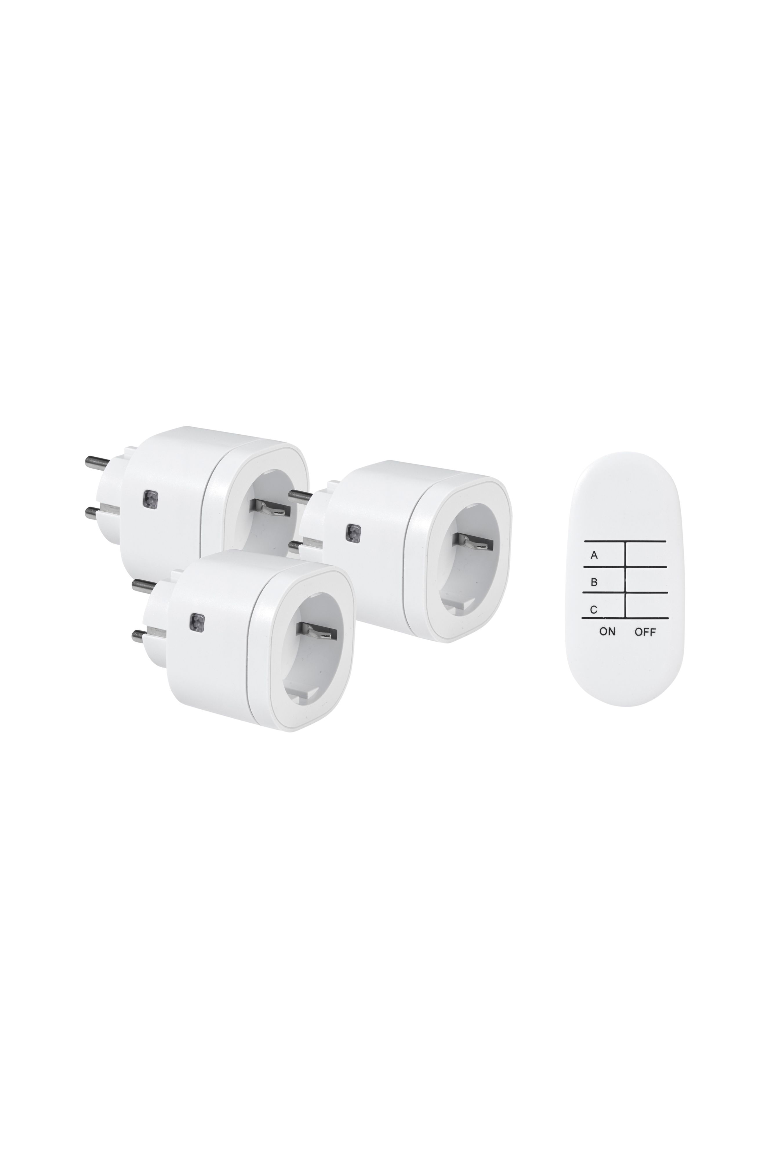 3-pack fjärrströmbrytare för inomhusbruk. Max belastning 3000W. Standbyenergiåtgång <1W. Fjärrkontrollens räckvidd är 25 meter i öppet område.