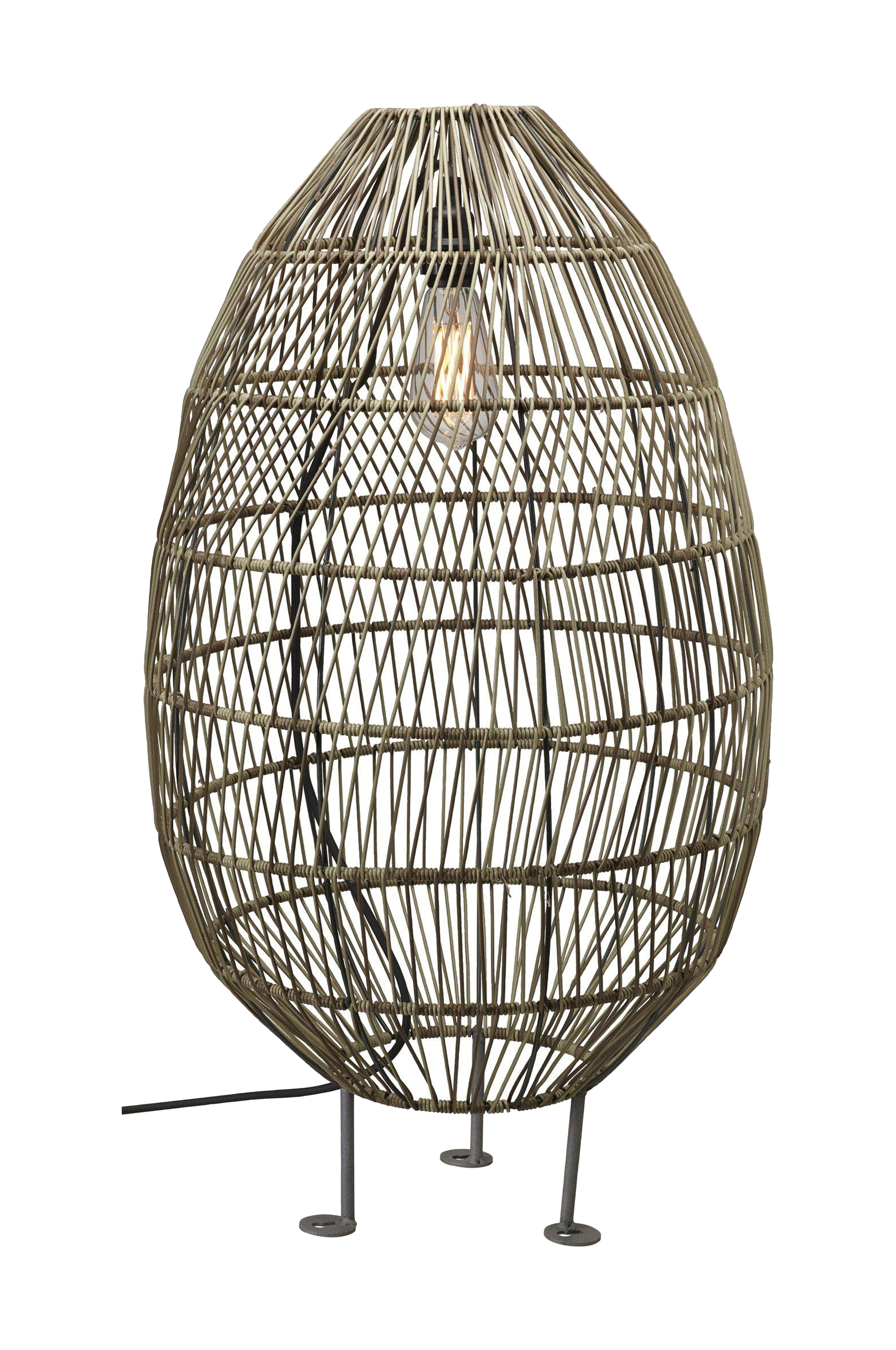 Golvlampa haanoi för utomhusbruk i polyrattan, finns i 3 storlekar. Polyrattan är ett tåligt material som klarar väder och vind. Den flätade strukturen skapar ett vackert ljus. Här kombinerad med 2,5 m flex out sladdstativ för utomhusbruk. Höjd 50 cm, bredd 30 cm och djup 30 cm. Ljuskälla köps separat.