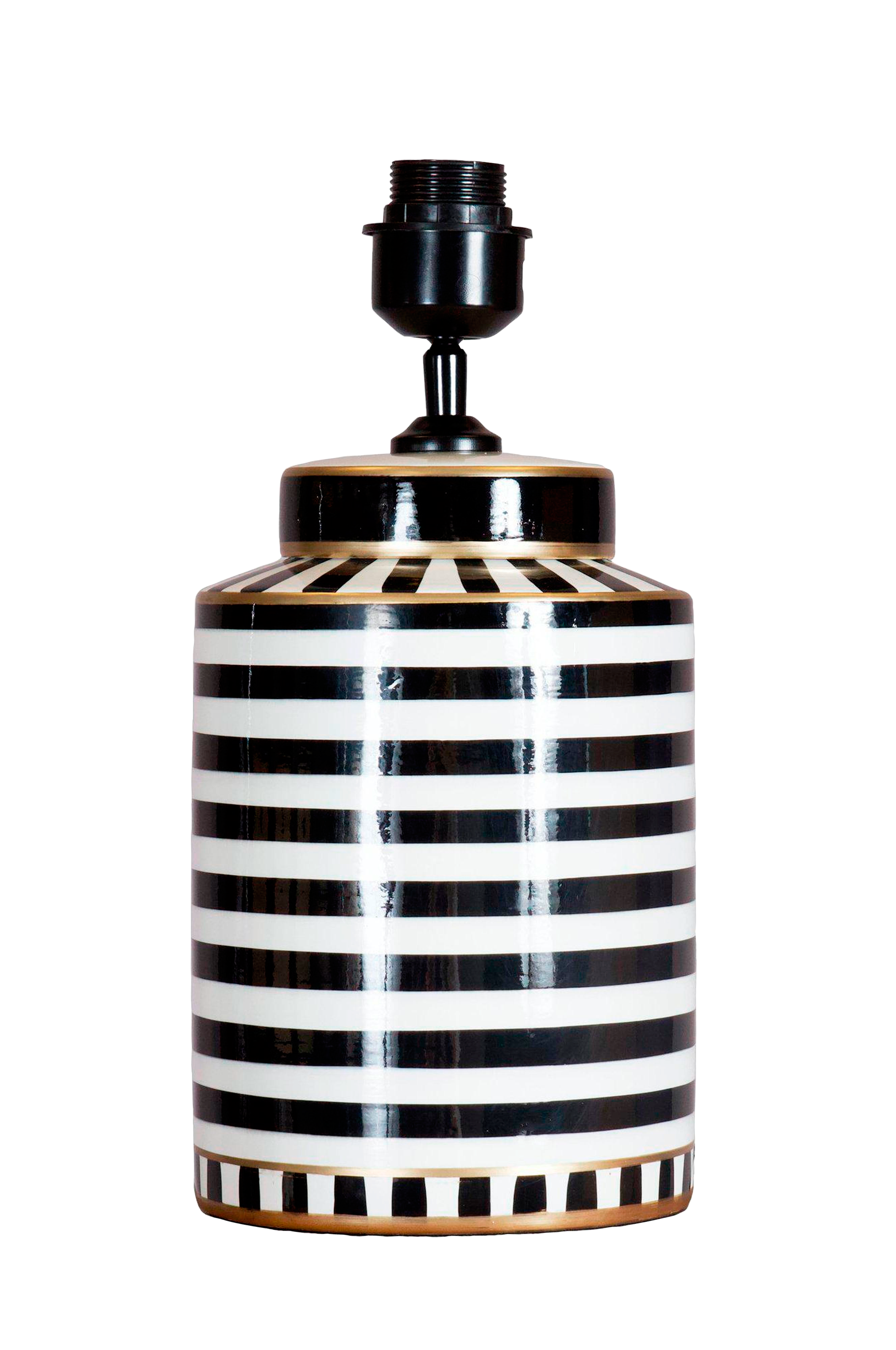 En slående bordslampa med tidlös elegans - denna randiga keramikfot, med en gyllene touch, ger en djärv men ändå raffinerad art deco-stil till alla rum. Den grafiska kontrasten och den skulpturala formen gör den till lika mycket ett dekorativt föremål som en ljuskälla, perfekt för interiörer som hyllar både historia och personlighet. Lampan mäter 36 cm i höjd (inklusive sockel) och 17 cm i diameter och har en balanserad silhuett som passar utmärkt på ett sidobord, en konsol eller en fönsterbräda. Lampan har en e27-sockel (max 40w) och levereras med en 180 cm lång textilsladd försedd med en europeisk kontakt. Strömbrytaren är bekvämt placerad 35 cm från basen. Ljuskällan säljs separat. En lampa som gör ett statement - raffinerad, grafisk och full av karaktär.