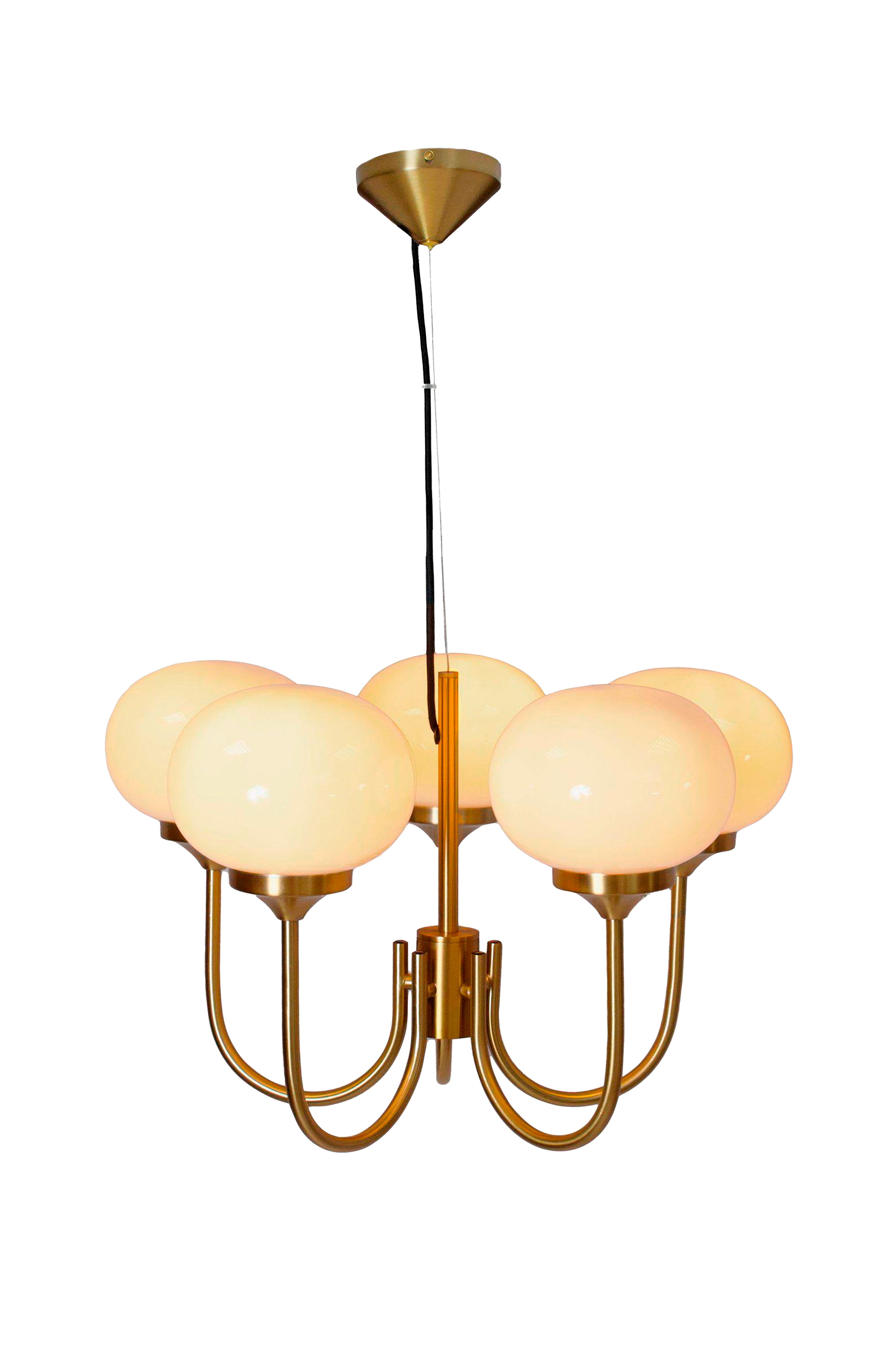 Lyft ditt utrymme med en taklampa som blandar tidlös elegans med ett varmt, modernt sken. Denna eleganta armatur i borstad mässing har tre nedåtriktade armar, var och en prydd med en bärnstensfärgad glasskärm som ger ett mjukt och inbjudande ljus. Den varma tonen i glaset skapar en mysig och välkomnande atmosfär - perfekt för vardagsrum, matplatser eller sovrum där både atmosfär och karaktär är viktiga. Med sin vackert rundade form och en diameter på 55 cm blir lampan en naturlig fokuspunkt utan att överväldiga rummet. Lampan är utrustad med fem e14-socklar (max 15w), vilket gör att du kan välja de glödlampor som passar bäst för din stil och dina belysningsbehov. Glödlampor ingår inte, men vi rekommenderar att du använder opalfärgade glödlampor i antingen globe- eller ljusform för att förstärka glasets värme och säkerställa ett mjukt, jämnt ljus. Ljuskronans totala höjd är 35,5 cm och lampan monteras enkelt med en takkrok. Oavsett om du vill sätta stämningen över matbordet eller ge en elegant touch till din hall, erbjuder den här taklampan en raffinerad balans mellan stil och funktion.