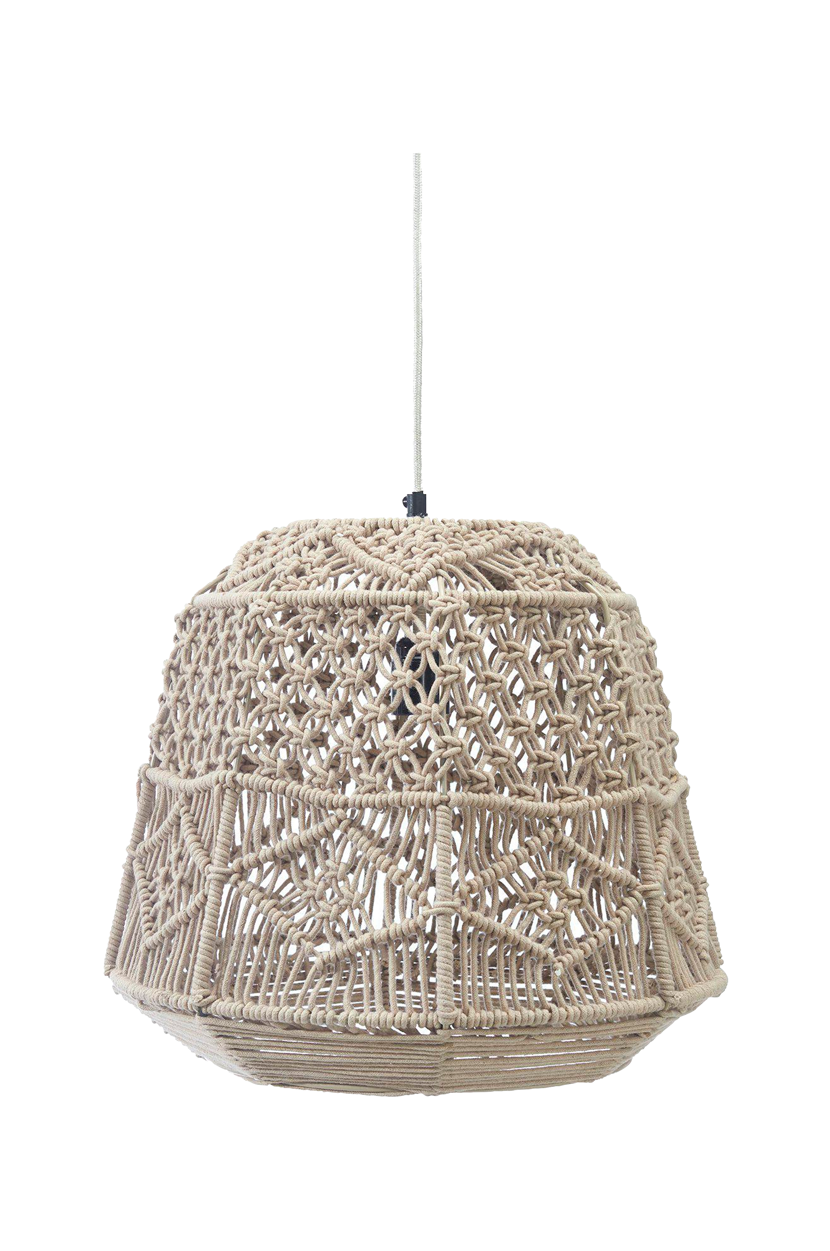Taklampa Jippe, en lampa gjord av handknuten macrame i bomullsgarn. En taklampa med mysig boho-känsla som ger ett vackert mönster när tänd. Metallstomme ton-i-ton. 1,5 meter textilsladd med takkopp för krokupphäng i samma färg som skärmen. Ljuskälla och takkontakt ingår ej. Lampan är handgjord och viss skillnad kan förekomma mellan lamporna.