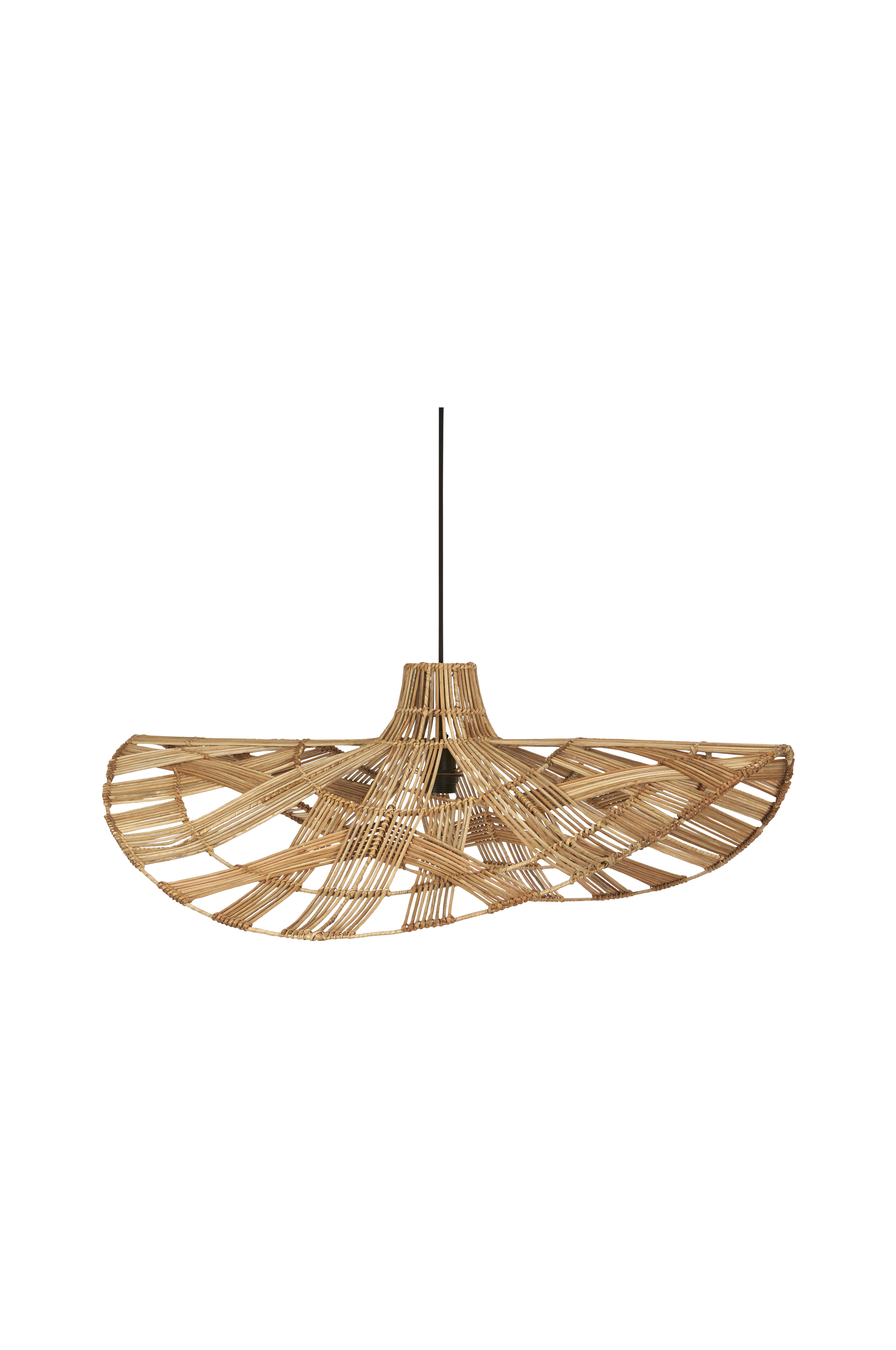 Takskärm Wella är gjord av flätad rotting är en stor takskärm som verkligen tar för sig. Skärmen med dess unika form och flätning silar ljuset och skapar ett vackert skuggspel. Skärmen levereras med ett svart sladdställ av plast som är 120 cm och har takkopp för krokupphänge. Observera att den levereras utan takkontakt, som måste köpas separat. Wella är anpassad för ljuskällor med E27-sockel och med en maxeffekt på 40W. Höjd 31 cm, bredd 75 cm, djup 81 cm. Ljuskälla ingår ej.