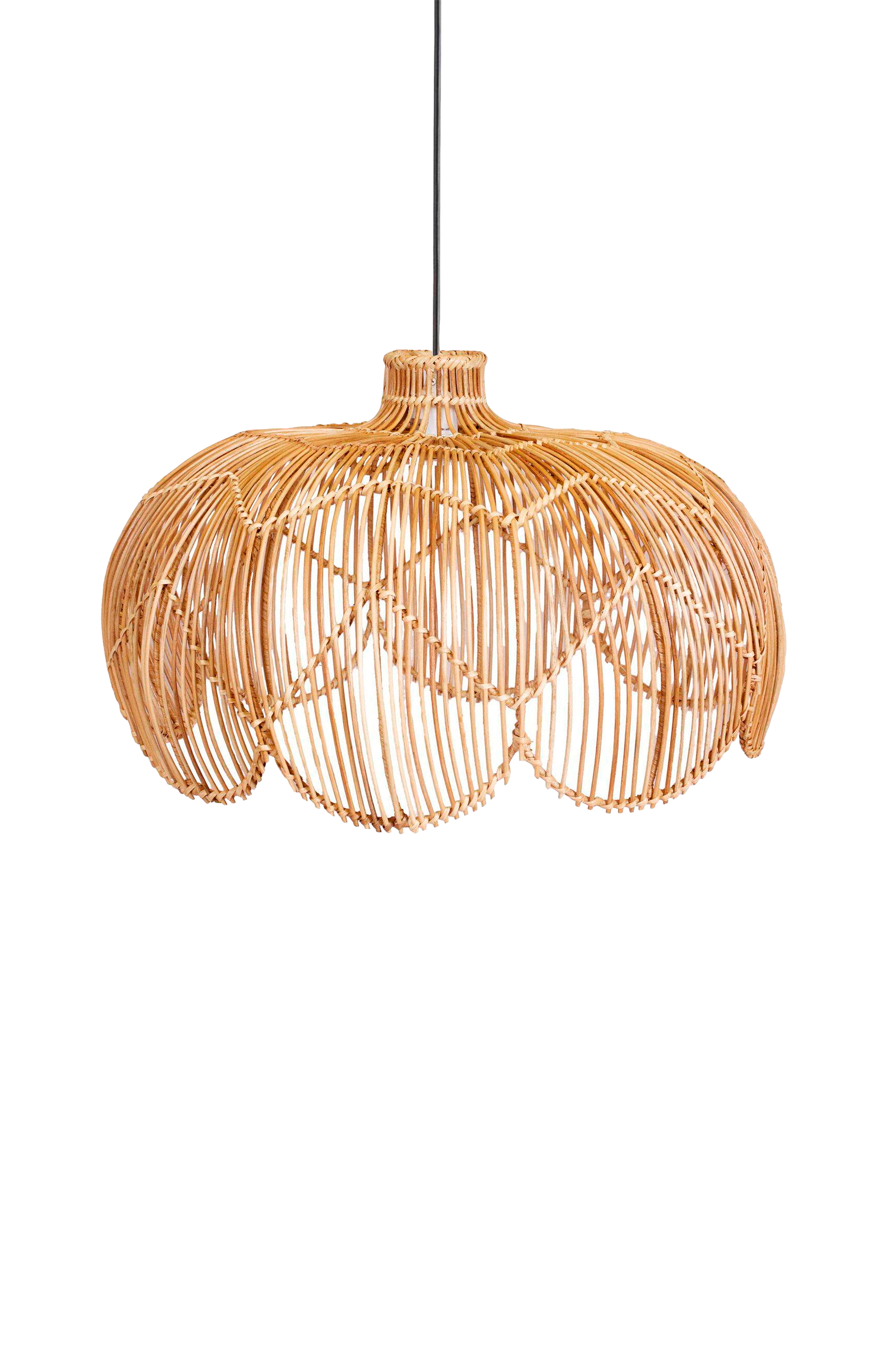 Belle är en vacker taklampa tillverkad av handvävd naturrotting som skapar en varm och inbjudande atmosfär i ditt hem. Den formade skärmen är tillverkad av noggrant sammanflätade rottingsträngar, vilket ger varje del sin egen unika karaktär. Den skålade kanten ger mjuka linjer och en touch av bohemisk charm till alla rum, medan den smala halsen upptill diskret döljer kabelanslutningen på ett elegant sätt. Eftersom lampan är tillverkad av naturmaterial kan små variationer i form och färg förekomma, och färgtonen kan förändras med tiden - en del av dess autentiska och organiska utseende. Belle har en diameter på 53 cm och en höjd på 32 cm, och levereras med ett svart kabelbeslag som är lämpligt för utomhusbruk. Ljuskälla max 40w (e27).