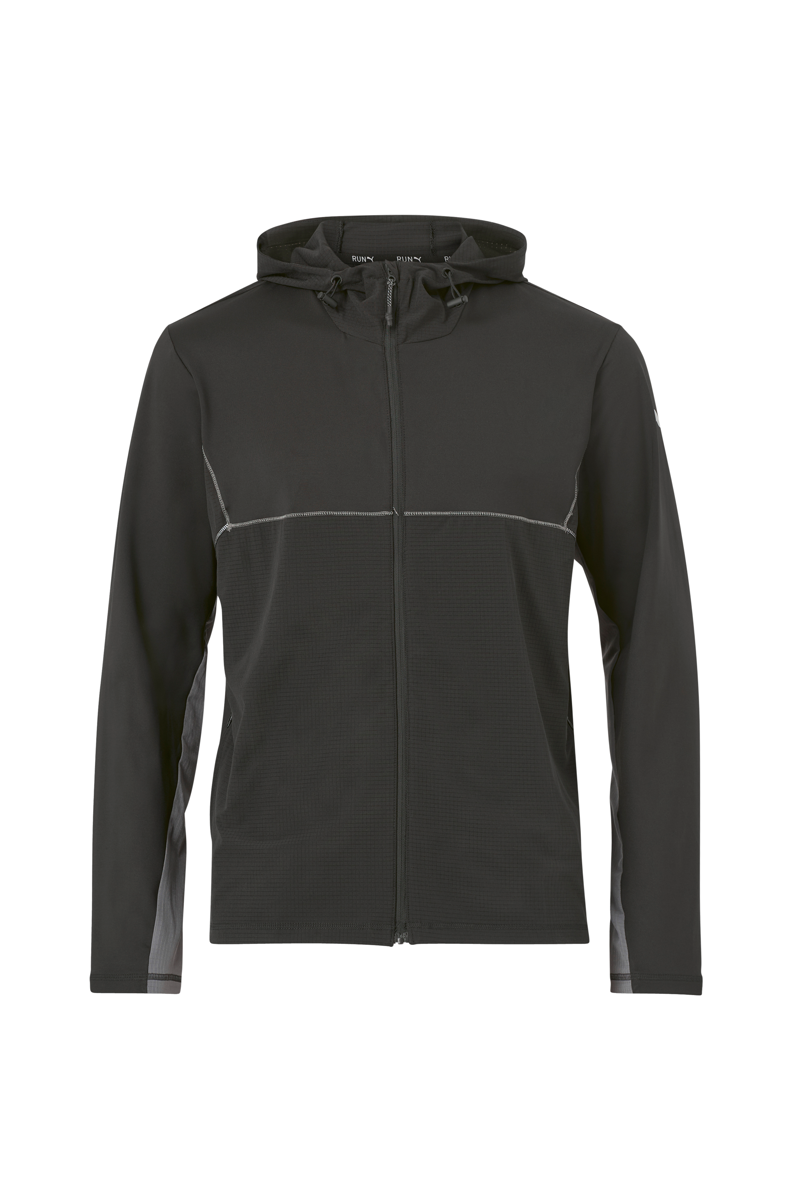 Löparjacka i rak modell av snabbtorkande funktionsmaterial dryCELL som transporterar bort fukt från huden. Dragkedja fram och hög krage med skavskydd vid hakan. Huva i mesh med dragsko och stoppers. Infällda sidfickor med dragkedja. Reflexdetaljer. Längd ca 71 cm i stl M.