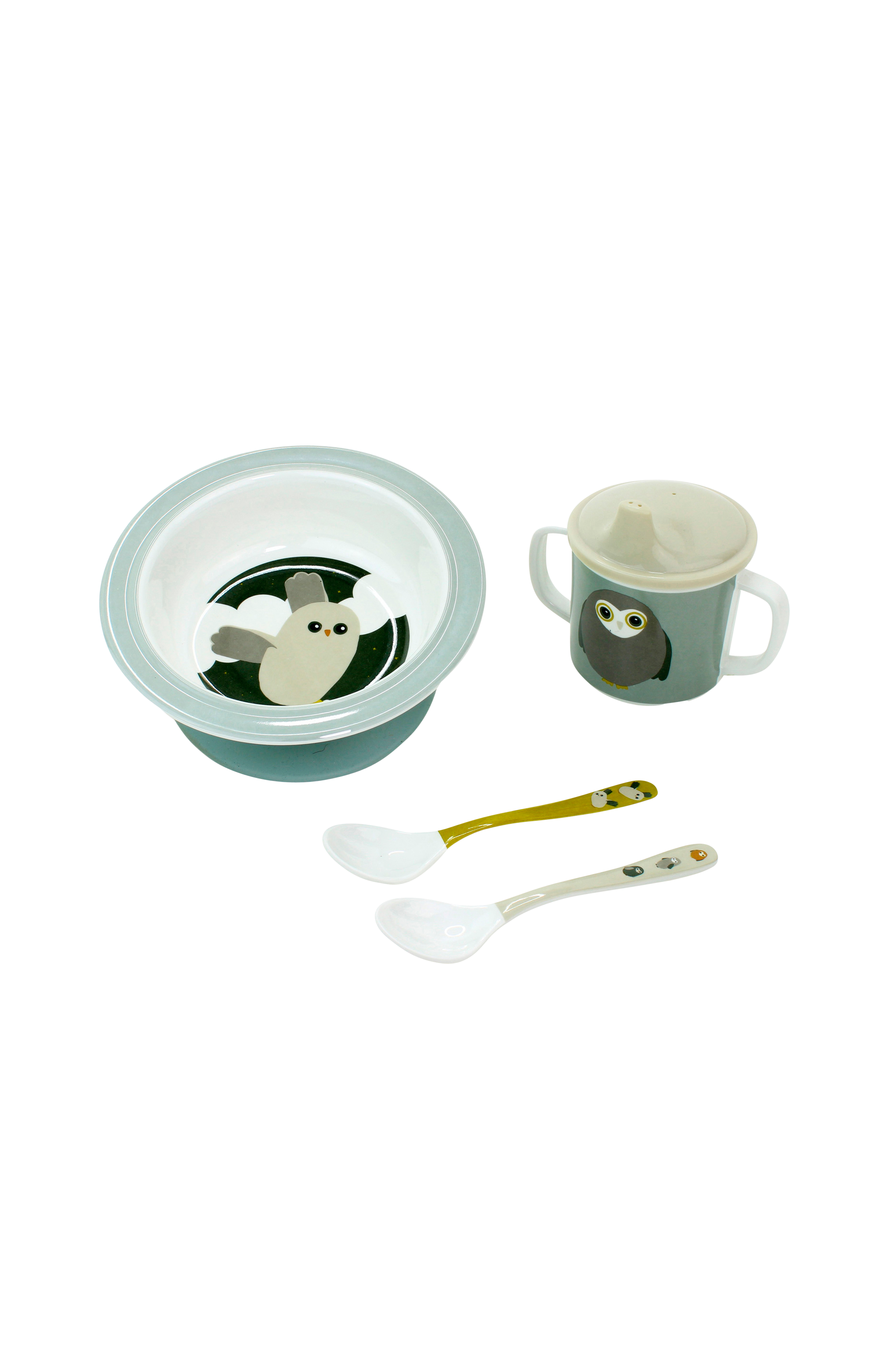 Superfint set i melamin med uggelmotiv!