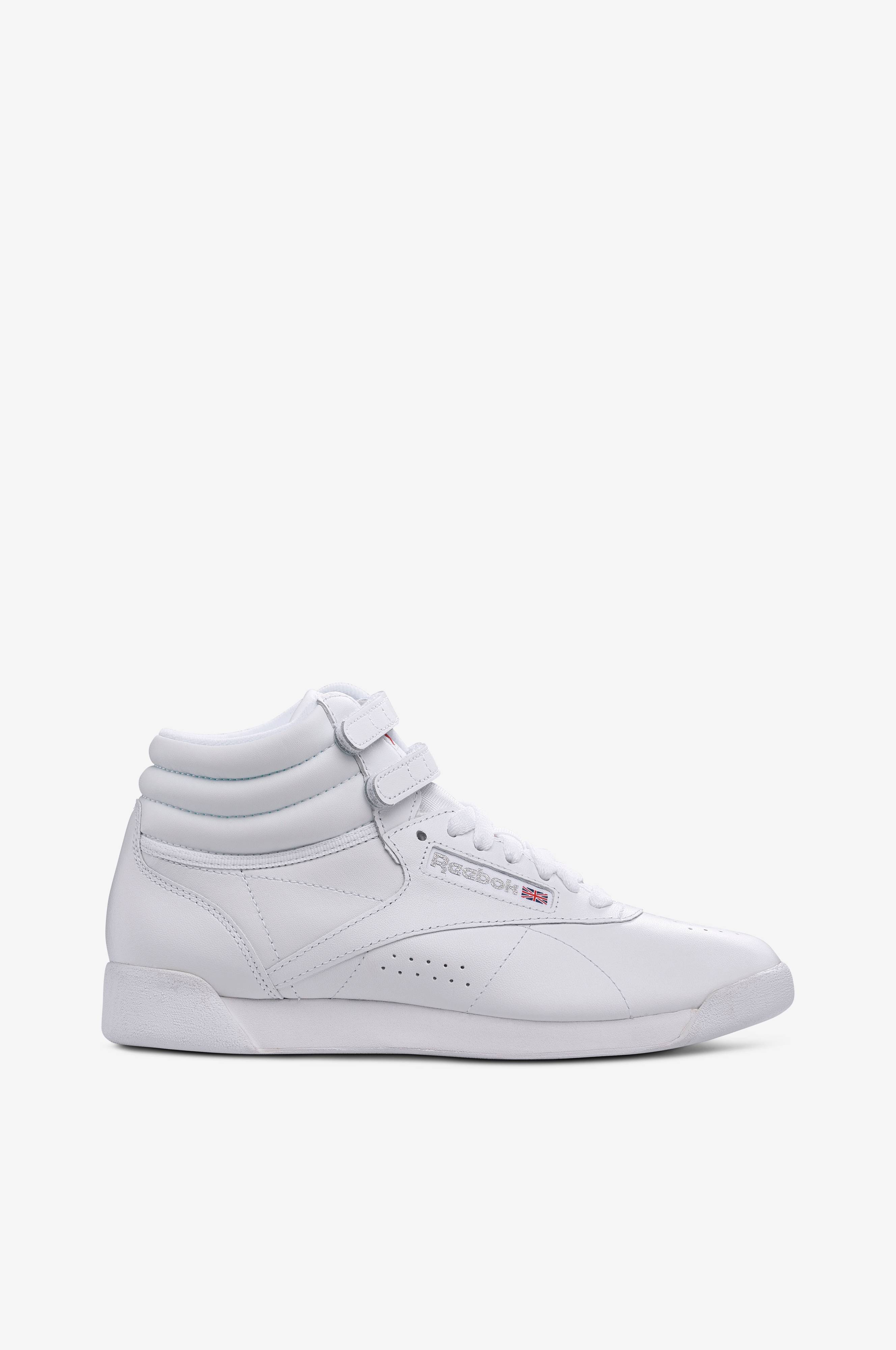 Sneakers Freestyle Hi från Reebok Classic är en helvit klassiker med dekorsömmar och ventilerande hålmönster. Hög modell med vadderat skaft med kardborrestängning. Snörning över vristen. Innersulan är urtagbar. Mellansula av lätt cellgummi som ger god dämpning. Skafthöjd mitt bak ca 9 cm.
