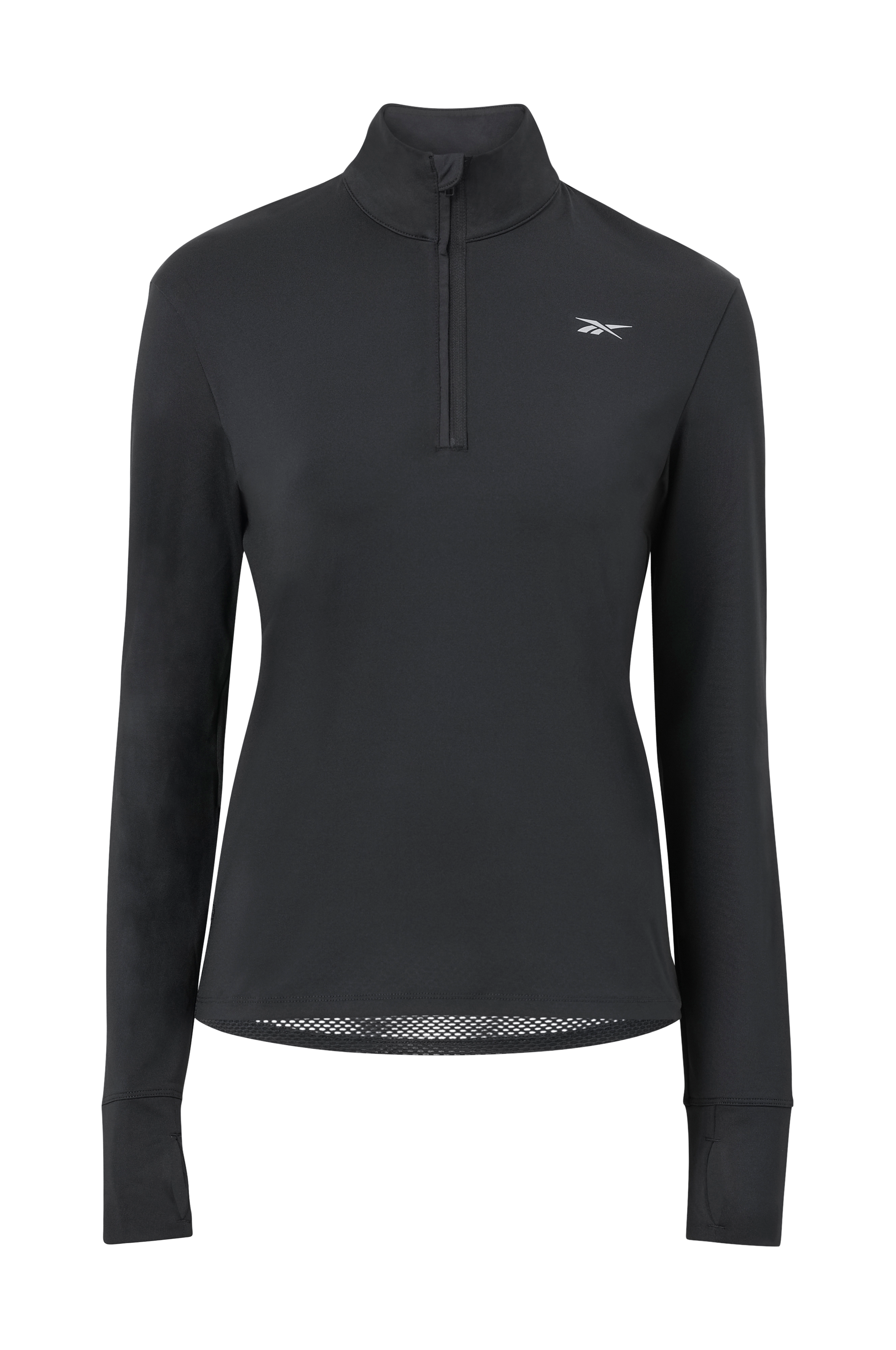 Långärmad löpartopp i stretchigt material med fuktavledande Speedwick-teknologi. Löst hängande ok bak. Ventilerande mesh i nedtill. Rund halsringning med kort dragkedja. Reflextryck på bröstet. Muddar med tumhål i ärmsluten.
