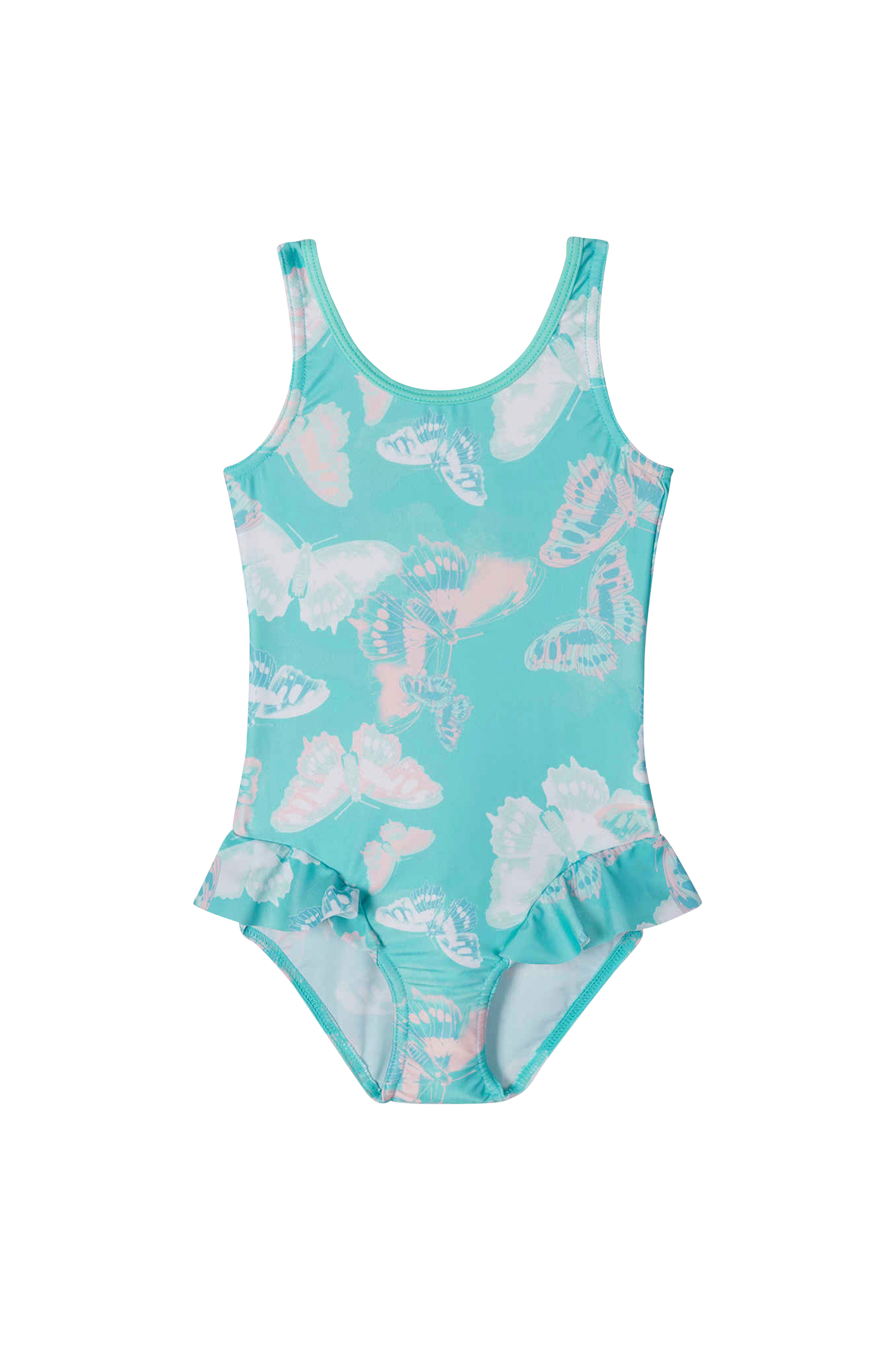 Baddräkt med solskyddsfaktor UPF50+. Volanger i sidorna och bak. Fodrad framtill.