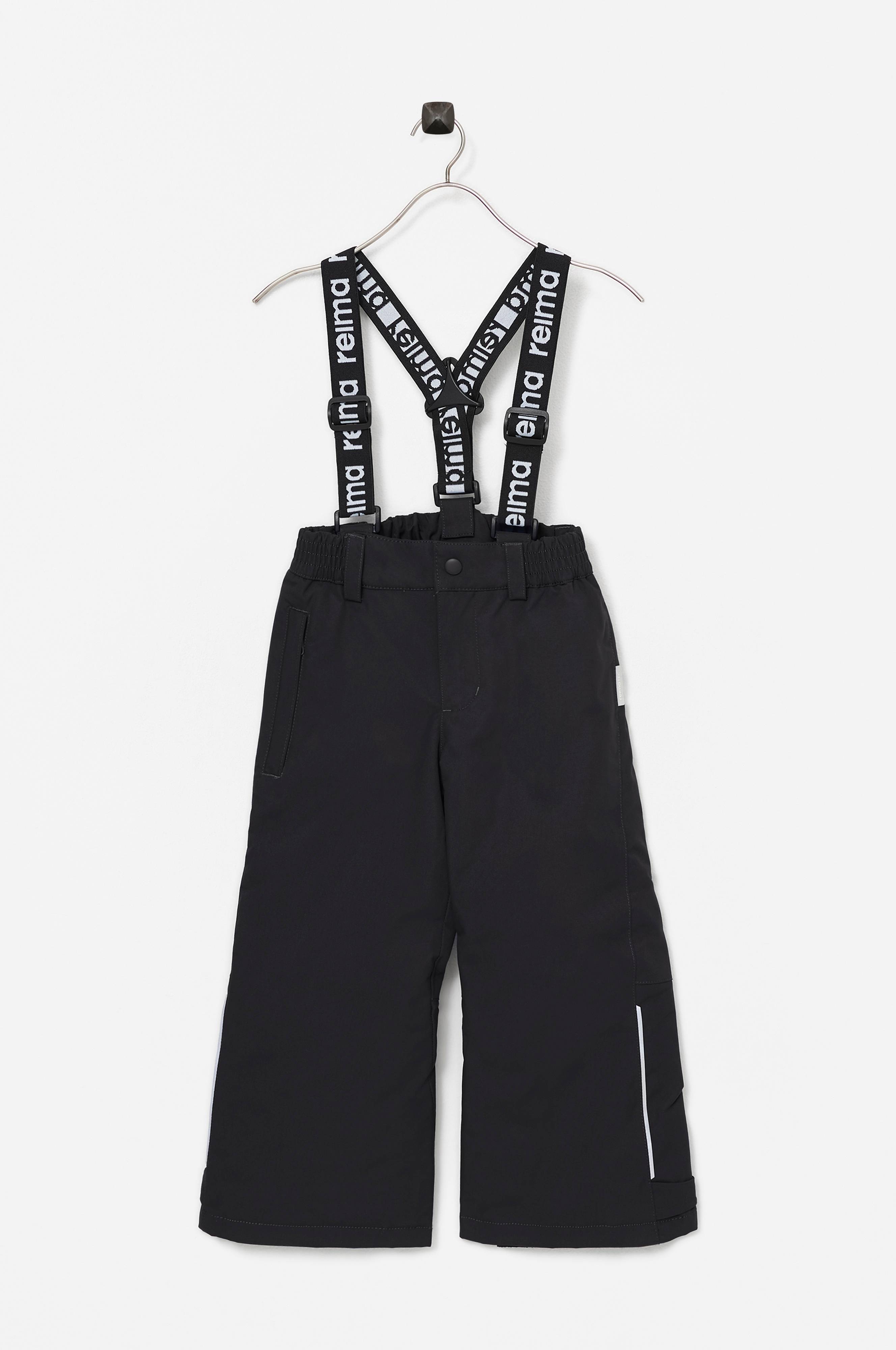 Avtagbara och justerbara resårhängslen. Elastisk linning med hällor, knapp och gylf med dragkedja. Bensluten har snölås och reglerbar vidd. Tål torktumling.