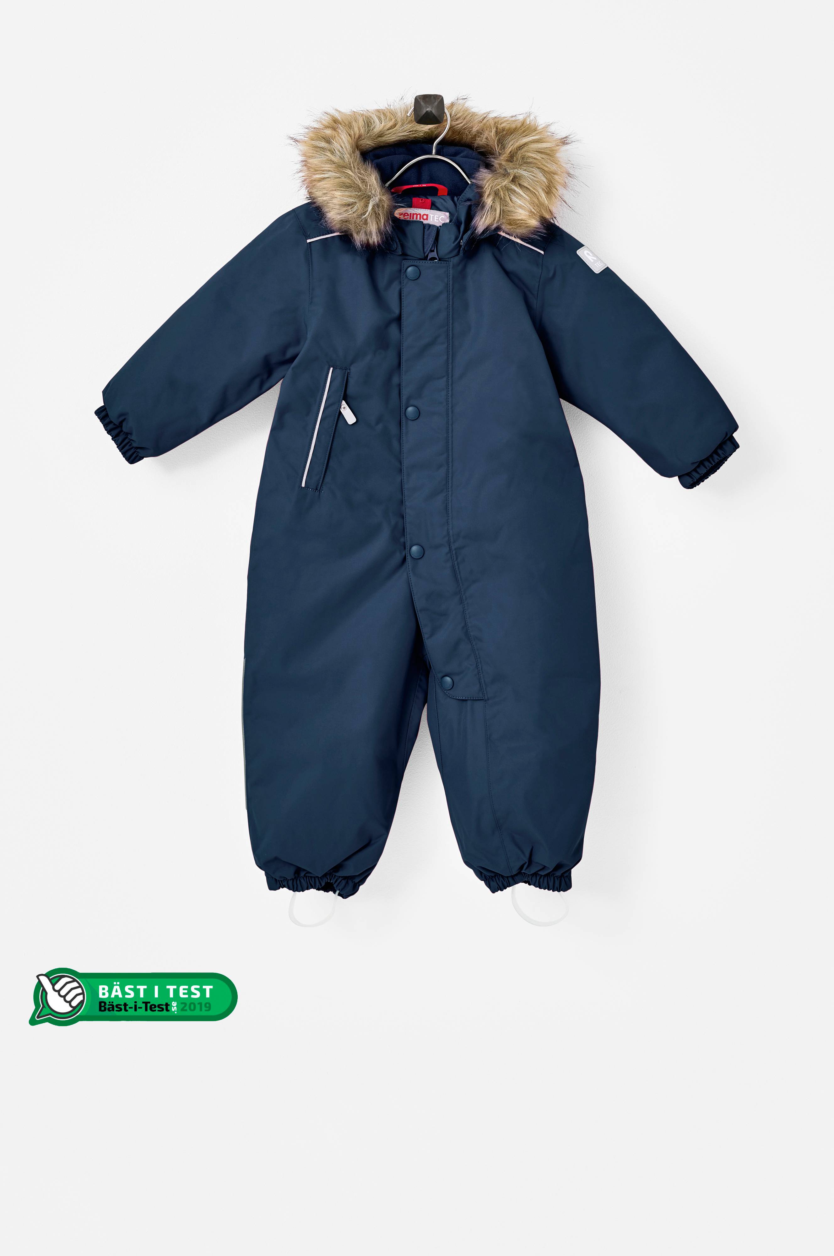Den mjukt fodrade huvan är justerbar och har en avtagbar fuskpälskant. Huvan är fäst med tryckknappar och är säker vid aktiva utelekar genom att den lossnar om den skulle råka fastna. Overallen stängs med dragkedja som har skavskydd vid hakan och en skyddande vindslå med tryckknappar. Overallen har extra isolering över rumpan, perfekt för lekar i snön. Det mjuka fodret i polyester underlättar påklädningen och är också perfekt vid användning av varma mellanplagg. Med Play Layers®-tryckknappar kan du enkelt fästa ett värmande mellanplagg från Reima® i overallen. Infälld resår i ärm- och benslut. Elastiska och avtagbara fothällor i silikon. En ficka med skyddad dragkedja. Reflexdetaljer fram, bak och på huvan.