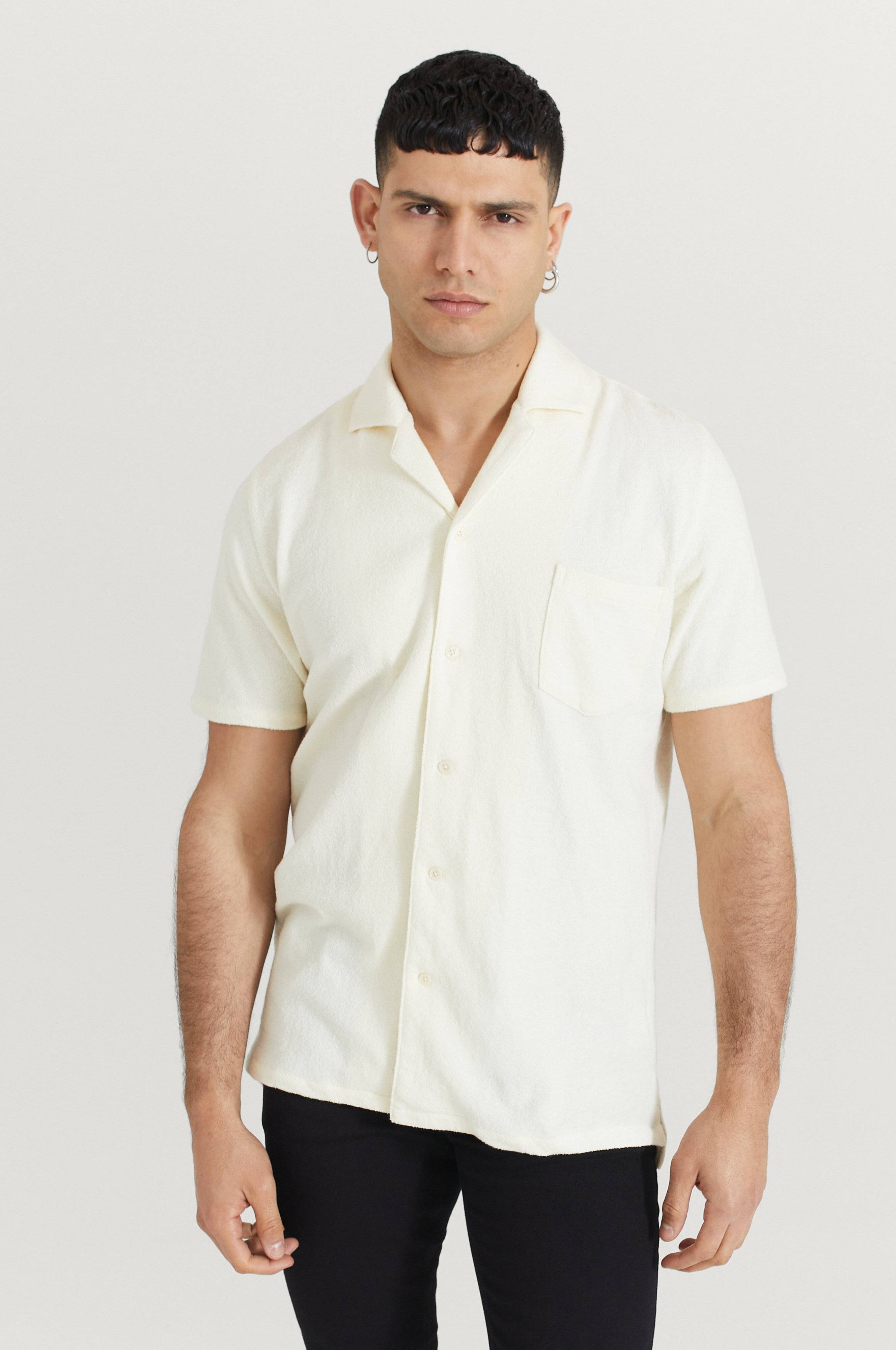 Skjorta från Resteröds i ett mjukt frottétyg. Skjortan har en klassisk krage och en bröstficka. Avslutet nedtill är rakt och i varje sida nedtill finns ett sprund. Passformen är normal.