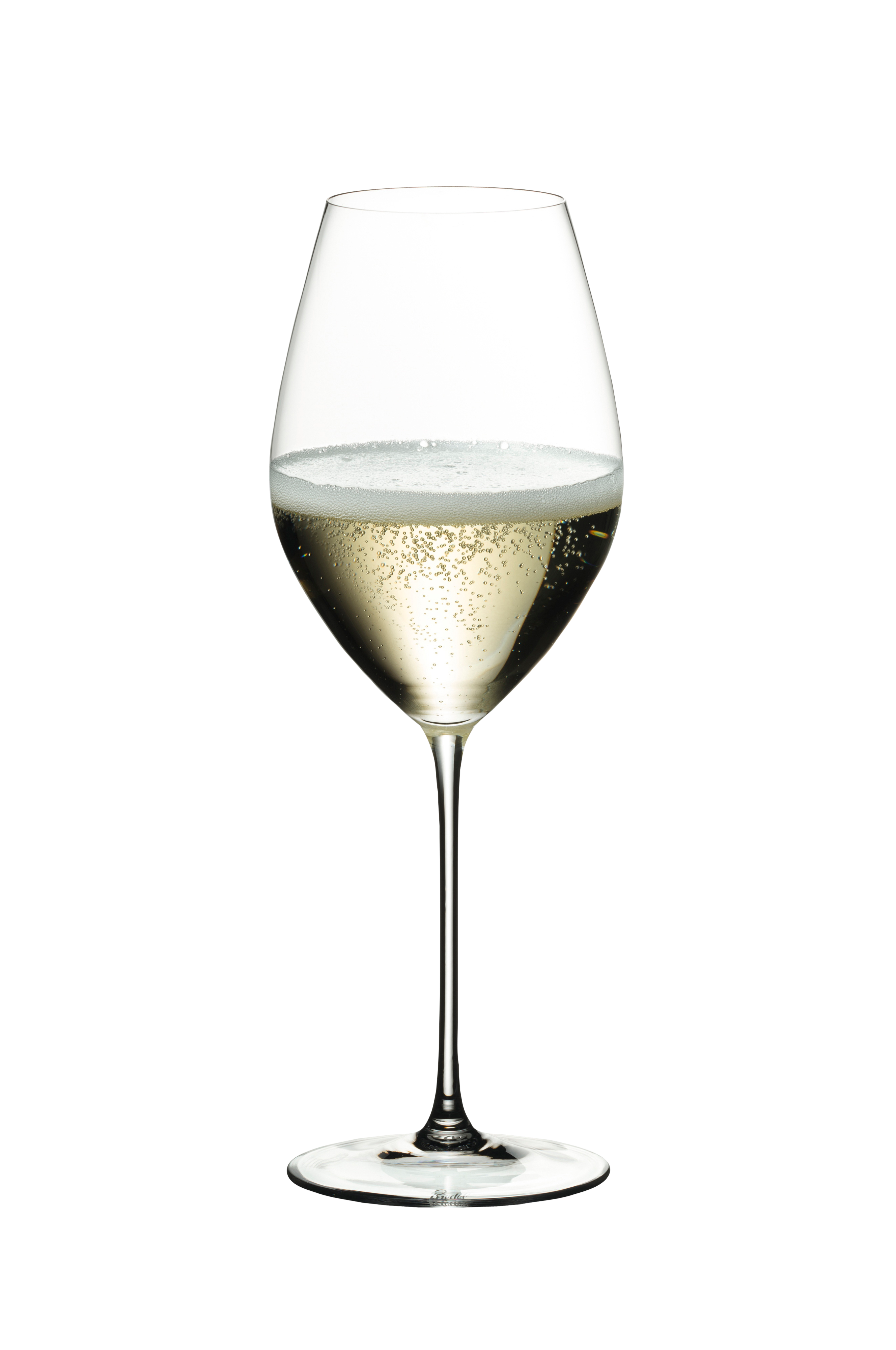 Riedels champagneglas skiljer sig från övriga druvspecifika glas, eftersom champagne enligt tradition görs av mer än en druva. Glaset framhäver en specifik dryck och inte en specifik druva. Kupan är spetsig nertill, vilket gör att det bildas en ström av bubblor inuti glaset som nästan liknar en pelare. Denna formation är inte bara vacker att se på utan gör också att champagnens ”liv” förlängs. Kupans vida mittparti lyfter aromerna i drycken och den avsmalnande öppningen koncentrerar i sin tur doften till näsan. Öppningen styr även drycken till tungans främre del, vilket gör att upplevelsen av sötma blir större.