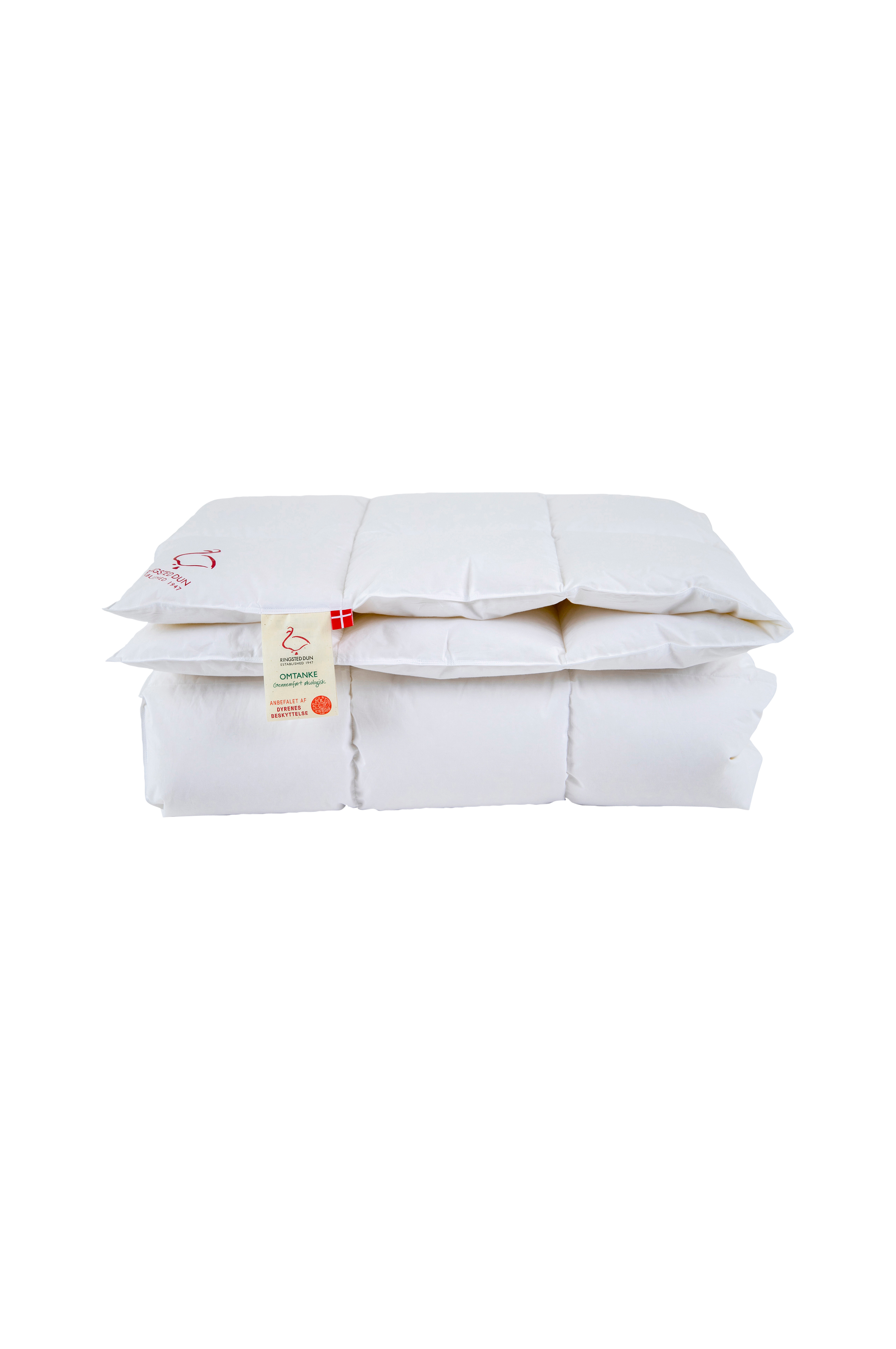 OMTANKE är de första duntäckena och kuddarna som är ekologiska in i minsta detalj, Svanenmärkta och som rekommenderas av den danska djurskyddsföreningen ”Dyrenes Beskyttelse”.