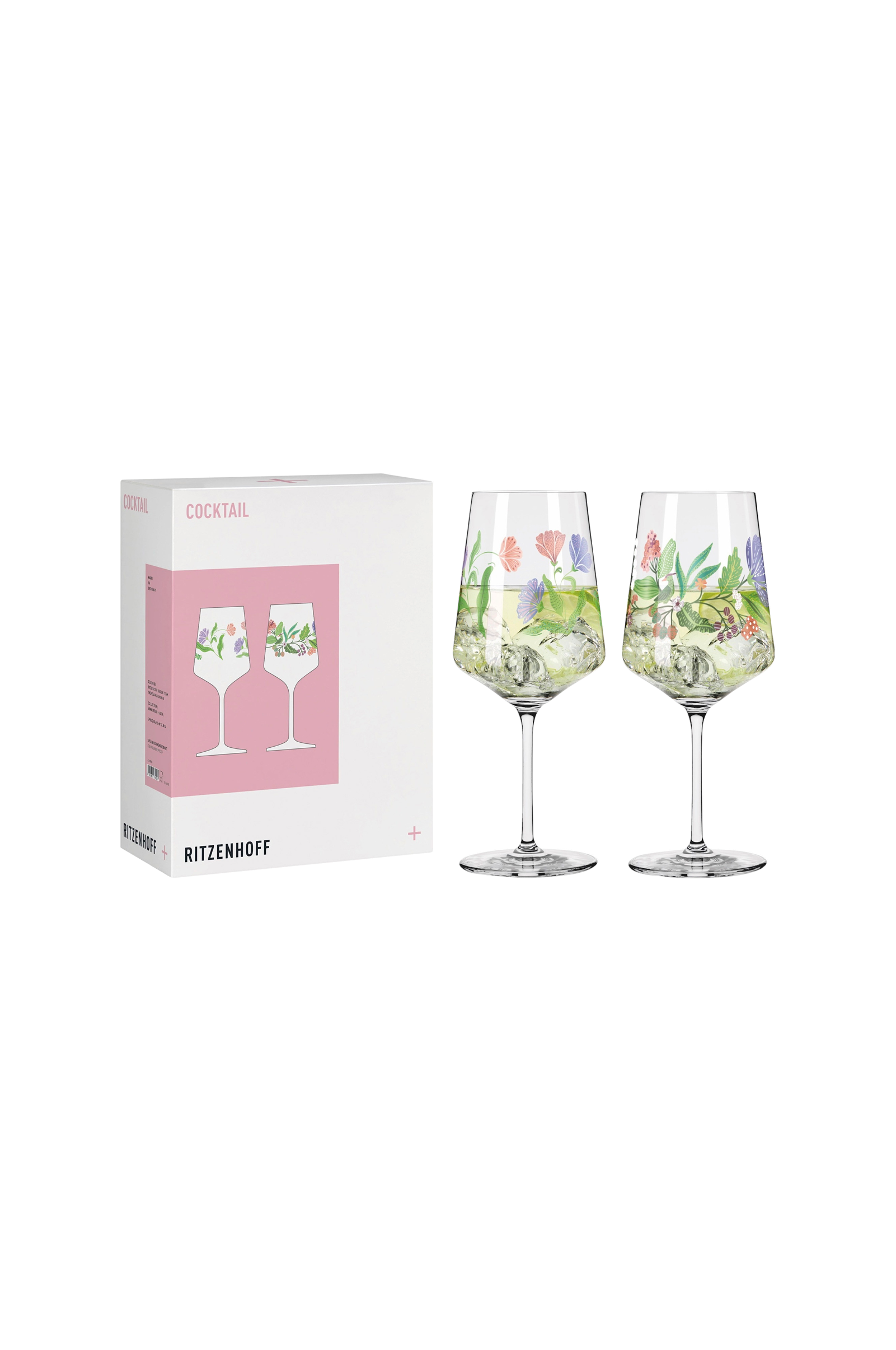 Vinglas från ritzenhoff. Fina blommor, fräscha gröna nyanser och mjuka pastellfärger för tankarna till en lugn sommarmorgon och ger varje drink en bekymmersfri, naturlig känsla. Ett set som på ett elegant sätt kombinerar lätthet och njutning.