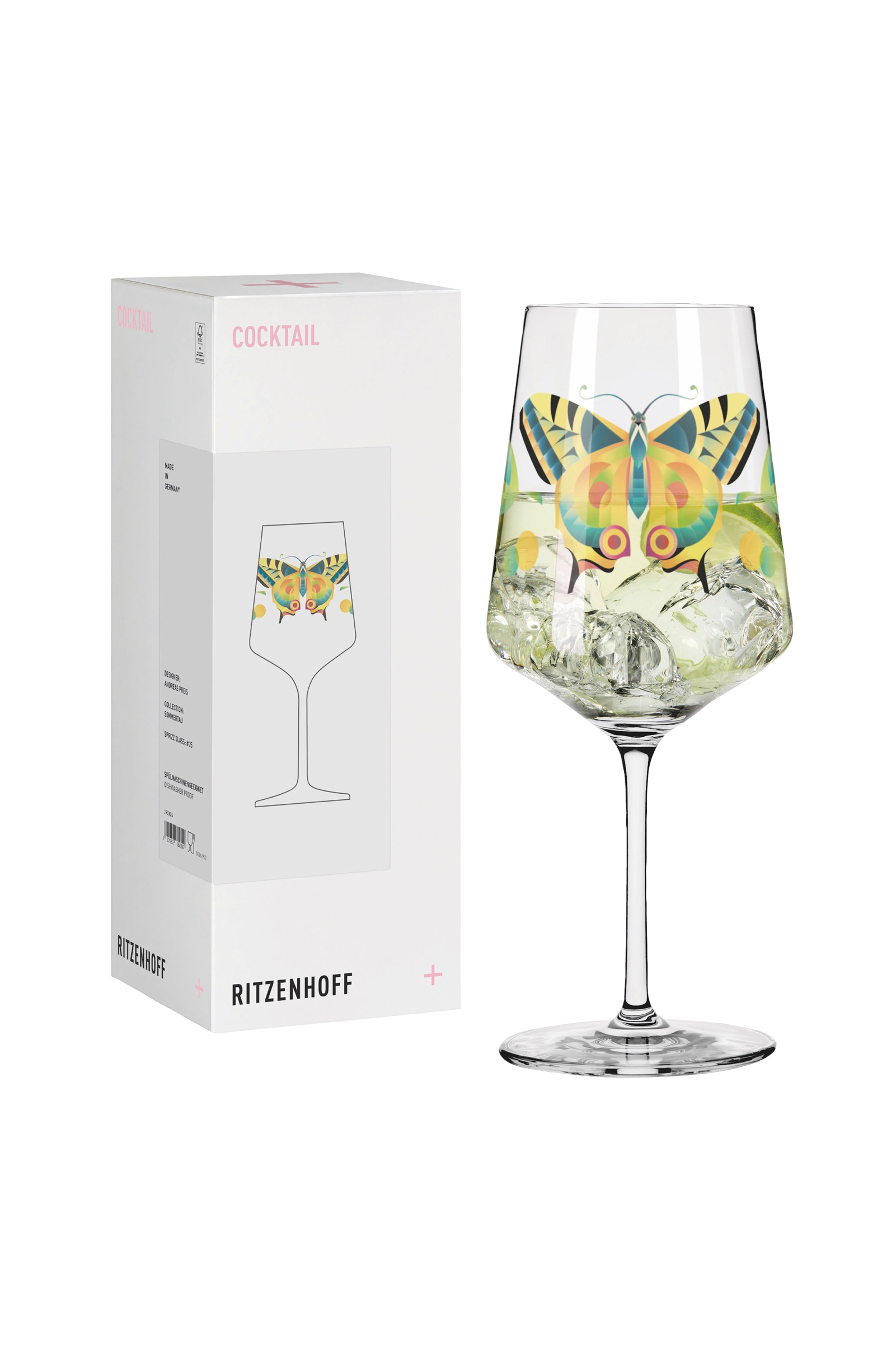 Vinglas från ritzenhoff. En färgglad fjäril ger lätthet och somrig friskhet till designen. Svävande former och mjuka färger skapar en livlig atmosfär och gör varje drink till en speciell njutning.