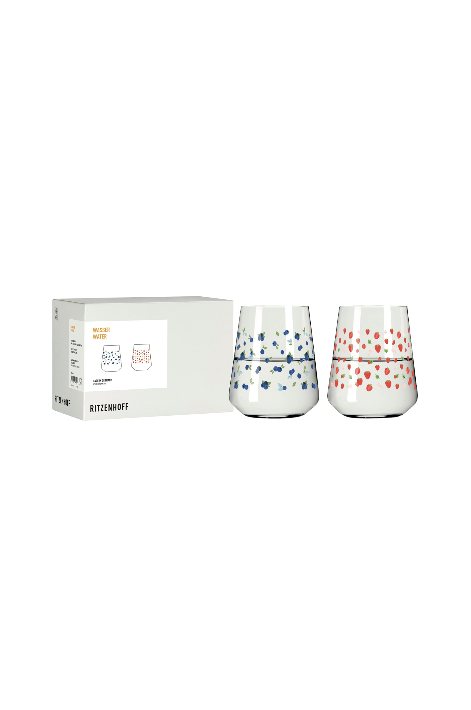 Vattenglas i 2-psc från ritzenhoff. Två fruktiga motiv ger naturlig friskhet och färg till bordet. Saftiga blåbär och ljusa jordgubbar ger livfulla accenter och ger varje dricksglas sin egen unika karaktär.