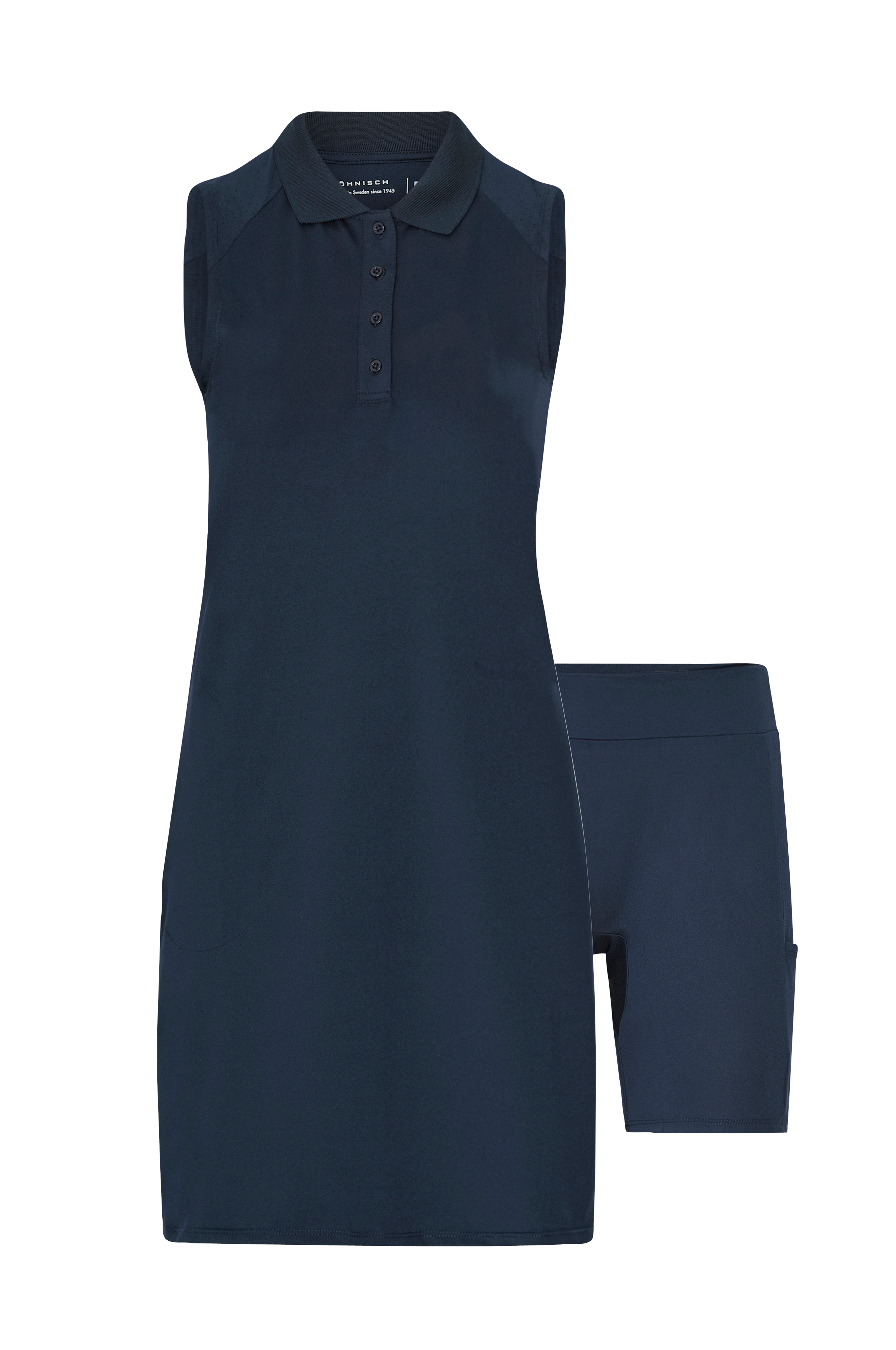 Ärmlös golfklänning i stretchigt material som är fuktavvisande och snabbtorkande. Tyget andas och håller huden torr. Ribbad krage och fyra knappar fram. Paneler med laserskurna hål för extra ventilation. Ficka i ena sidan med dragkedja. Stretchiga innershorts med ficka medföljer.