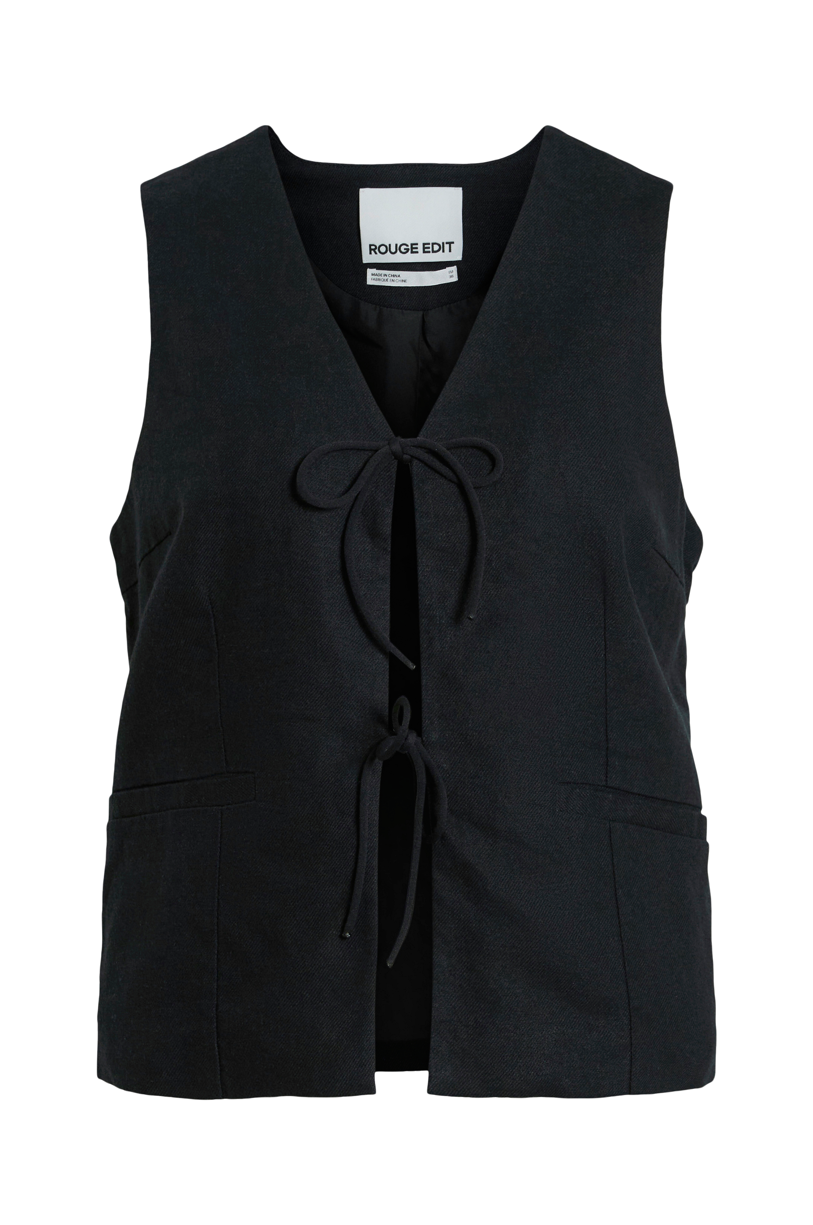 • Rak modell• V-ringad hals• Infällda fickor• Knytband i framkant• Fodrad