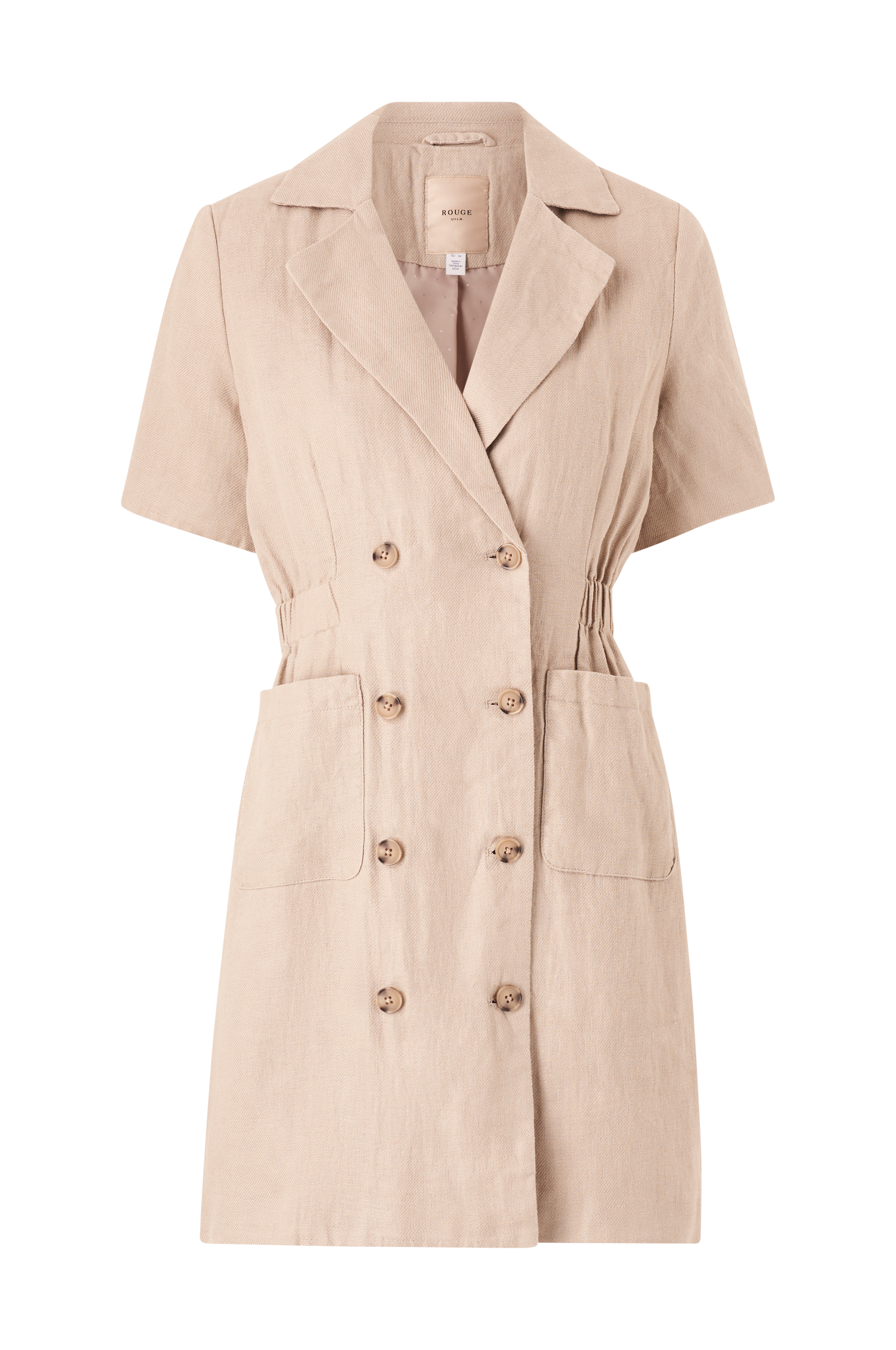 • Skjortklänning i linne• Figursydd modell med resår i midjan• Knappar fram• Krage med slag• Korta ärmar• Fickor fram• Vävt foder• Axelvaddar• Längd: 88 cm i storlek 36