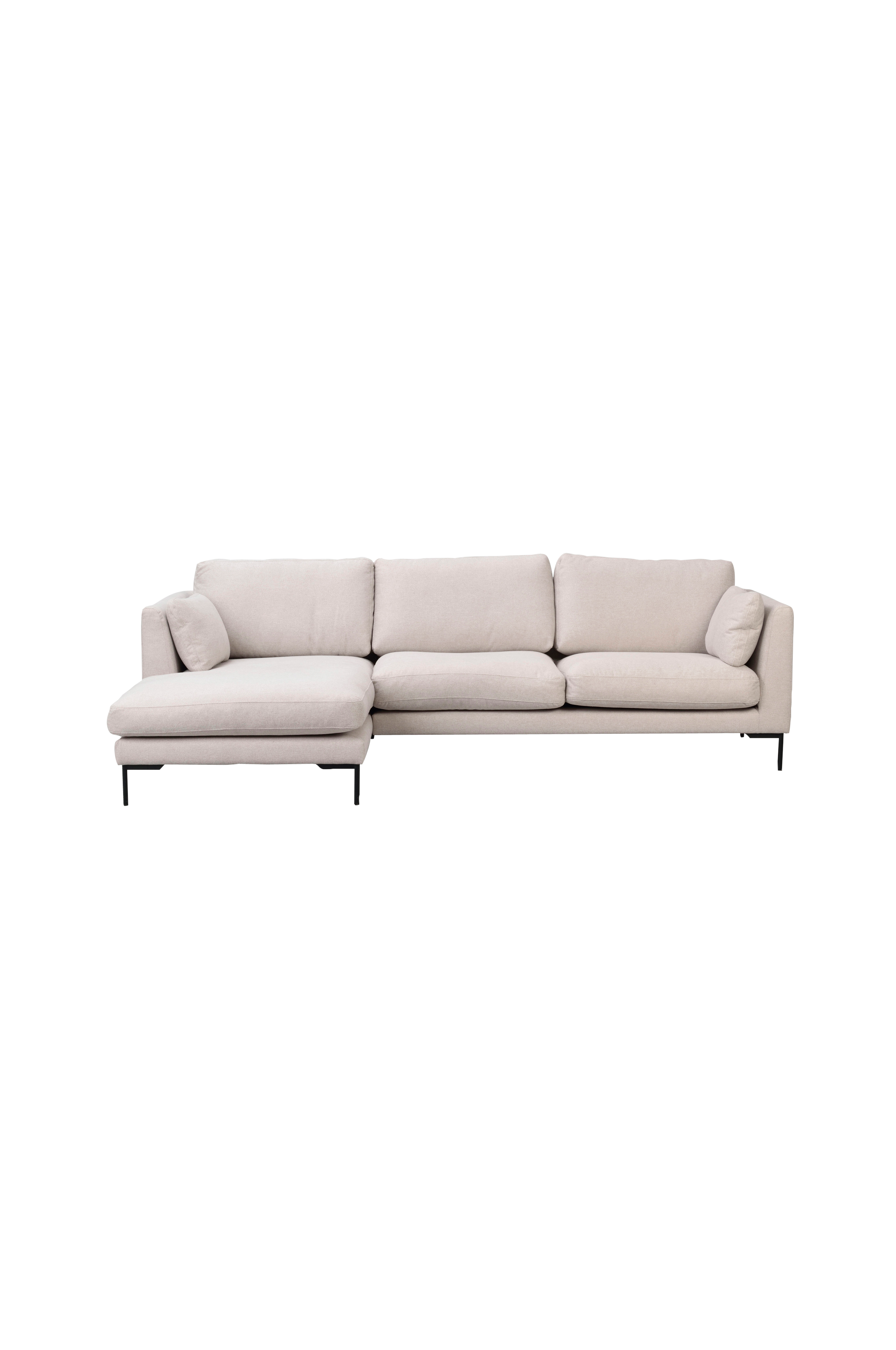Corwin 3,5-sits soffa chaise longue left rita #1 light beige har rundade ben i svart metall. Soffan har en klassisk, rak design med lösa ryggkuddar, vilket ger en elegant och exklusiv känsla i ditt hem. Den finns i flera konfigurationer för att säkerställa en kombination som passar perfekt i ditt utrymme. Sitsen har serpentinfjädrar för jämn och långvarig komfort. Allt trä i möblerna är fsc®-certifierat, vilket innebär att det kommer från ett ansvarsfullt skogsbruk som tar hänsyn till människor och miljö.