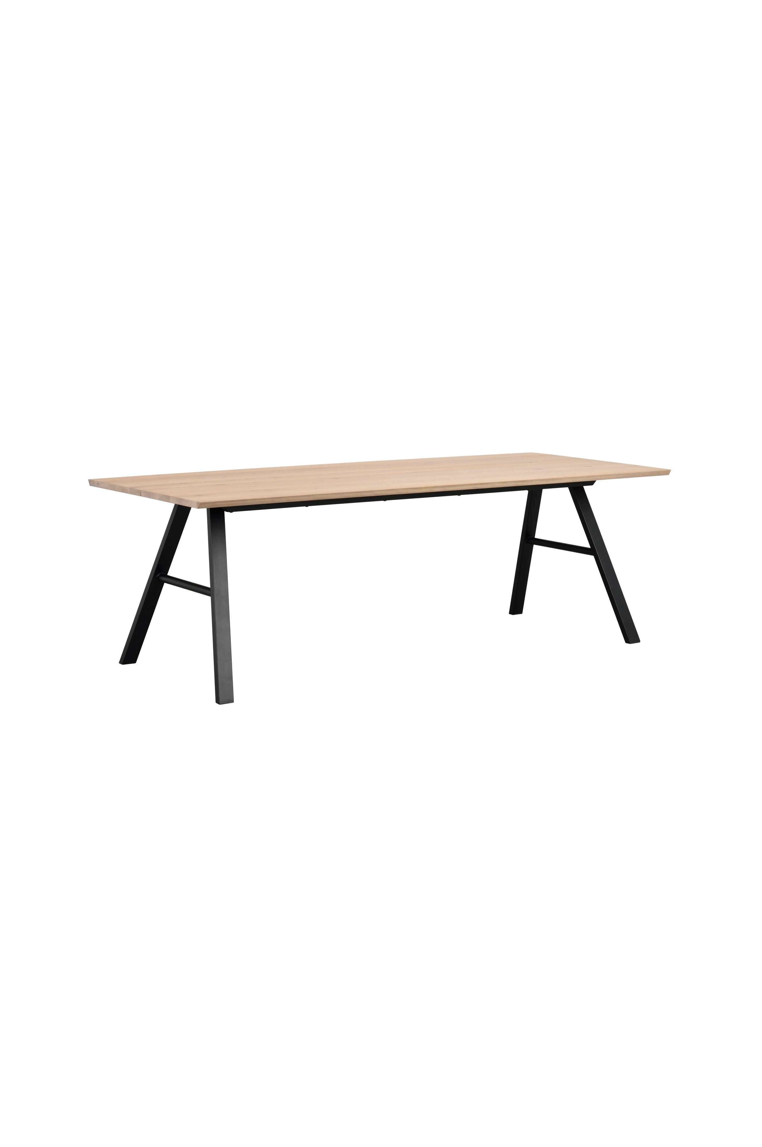 Brigham matbord med tvådelad bordsskiva i stilren design. Toppskiva i vild ek faner med massiva kanter och ben i pulverlackad metall. Längd 220, bredd 90 cm, höjd 75 cm. Det går att köpa till två tilläggsskivor om man vill förlänga bordet. Bordet ingår i vår serie Brigham.
