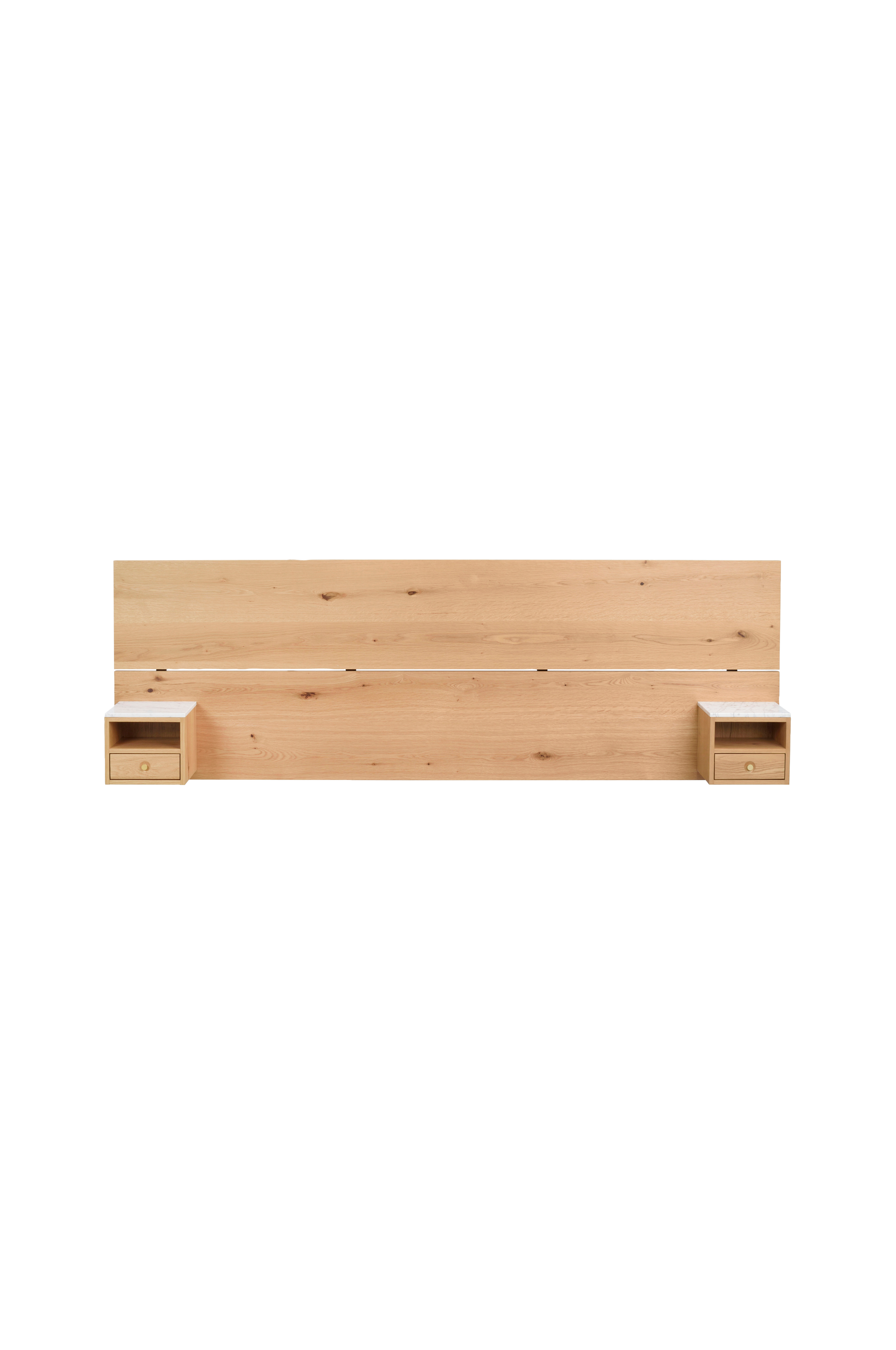 Whitmore sänggavel i vild ek förstärker den naturliga skandinaviska känslan i ditt sovrum. Med synliga kvistar och märken blir varje sänggavel unik, inspirerad av naturens skönhet. Sänggaveln levereras med två funktionella sängbord i elegant design med toppar i vit marmor och lådor med vackra mässingsfärgade knoppar. Whitmore sänggavel passar sängar som är 160-180 cm breda. Tack vare de justerbara metallbenen kan du välja höjden på sänggaveln, från 114 till 139 cm. Fästen för att fästa sänggaveln i väggen ingår. Höjd exklusive ben: 79 cm. Finns även i vitkalkad ek.