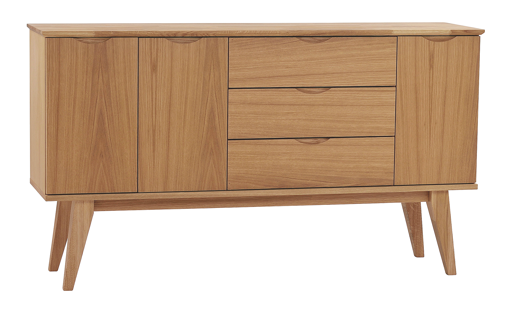Stilrent sideboard med generös förvaring. Skåpet är i ek och har rymliga lådor och skåp med dämpande stängning. Benen är lätt utställda vilket ger ett modernt uttryck. Bredd 150 cm, djup 40 cm och höjd 85 cm. Sideboardet är monterat vid leverans.