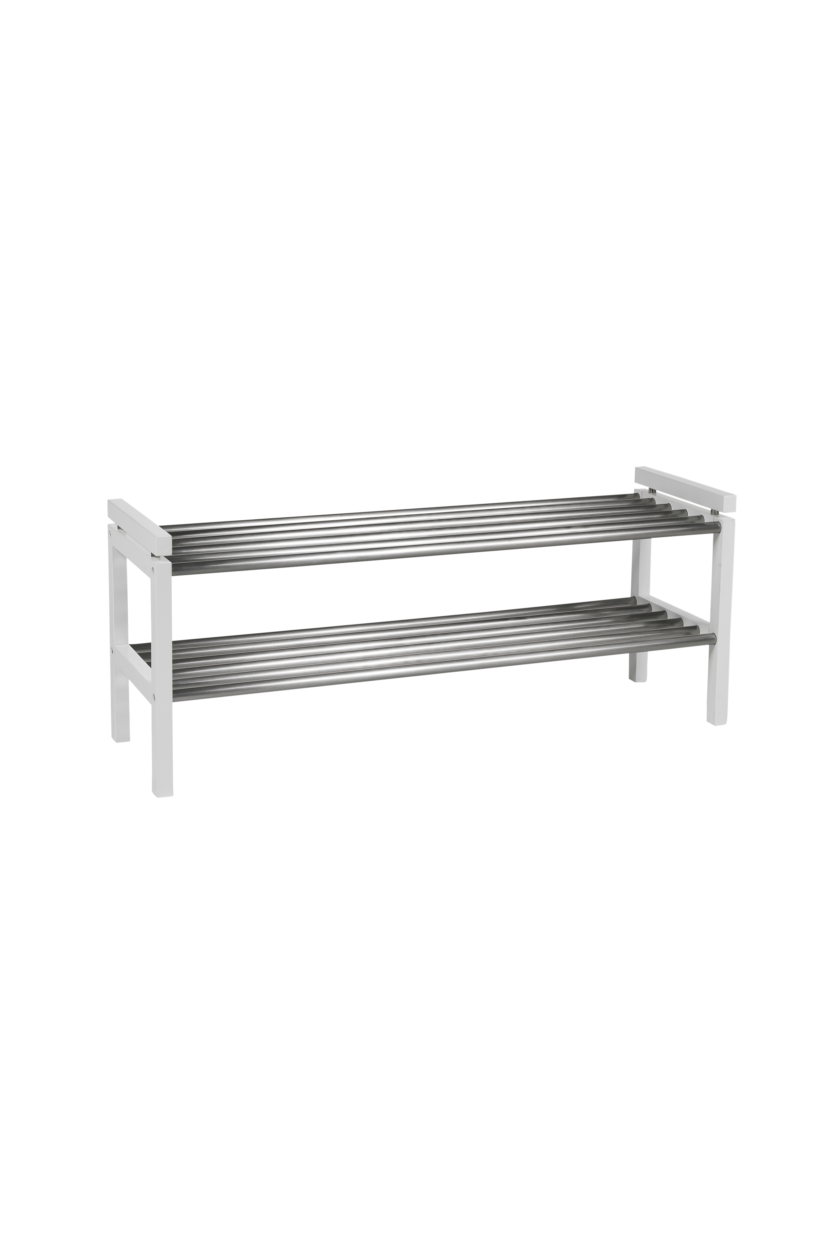 Confetti skoställ.Dekorativa ribbor i metall. Bredd 100 cm, höjd 40 cm, djup 30 cm. Stilren och enkel att placera. Skostället ingår i vår hallserie Confetti.