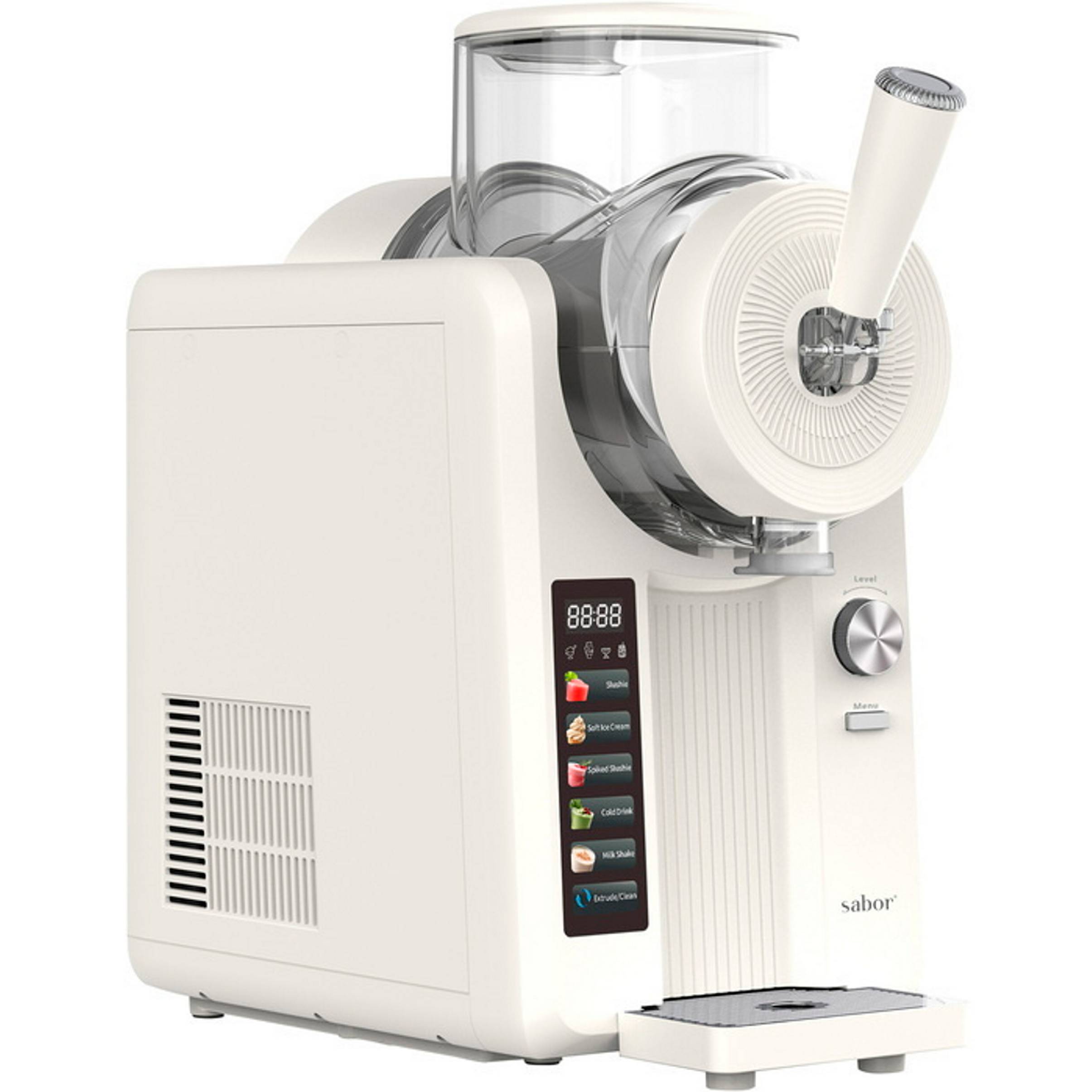 Med sabor icecraft kan du enkelt göra slush, soft serve, sorbet, milkshakes och kalla drycker på mindre än en timme. Maskinen är utrustad med 6 förinställda program, inklusive ett rengöringsprogram. Beroende på om du gör slush eller glass pågår programmen mellan 15 och 60 minuter. Tack vare den inbyggda kompressorn och kylelementet krävs ingen förfrysning. Förbered bara din blandning, häll den i behållaren och välj önskat program. Kom ihåg att tillsätta socker för bästa resultat. Recepthäfte medföljer.
