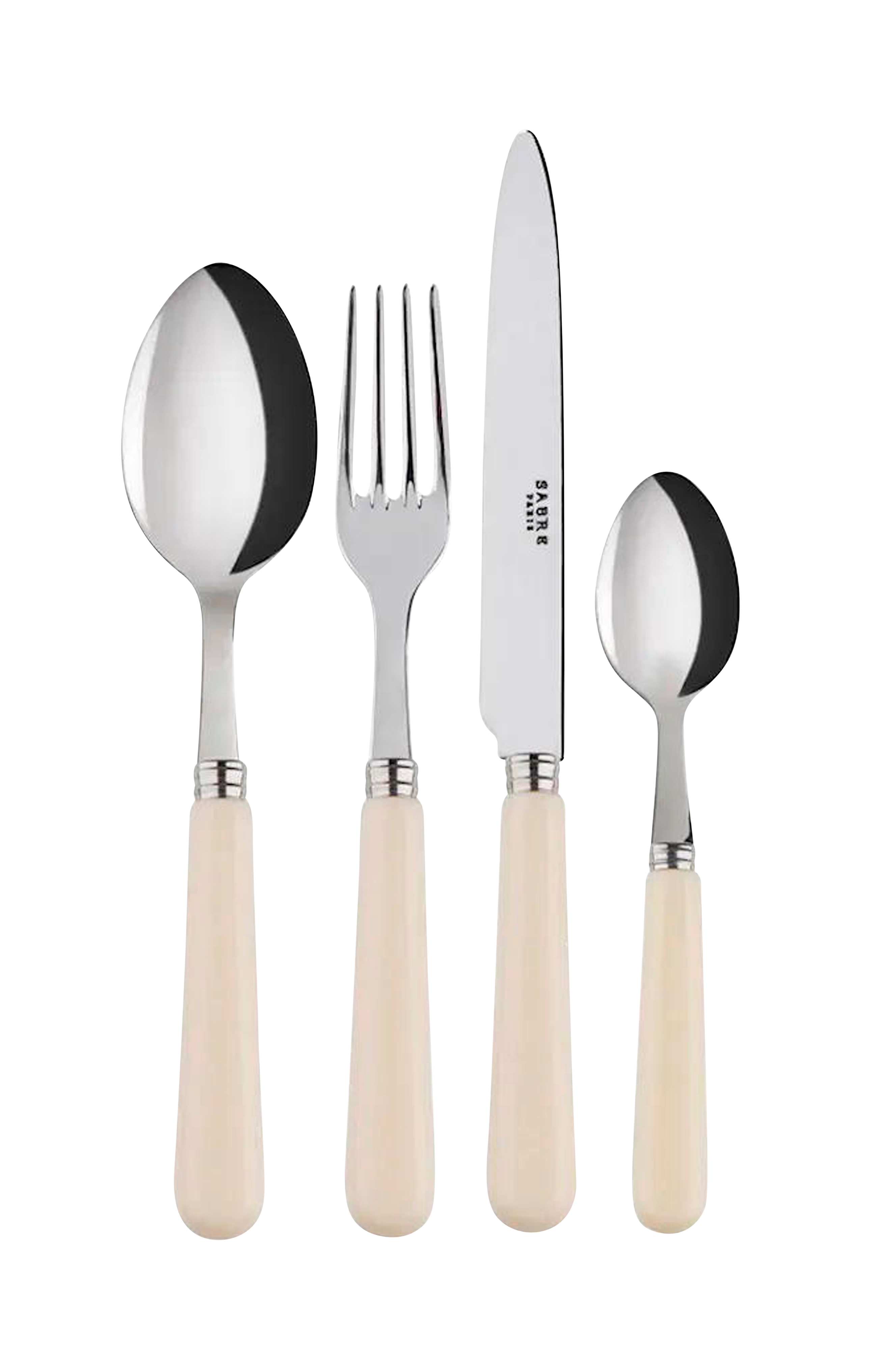 Sabre bestickset i fyra delar består av en soppsked, en gaffel, en kniv och en tesked. Detta set i fyra delar är perfekt för dina vardagsrätter. Finns även som en del av ett bestickset i 24 delar.
