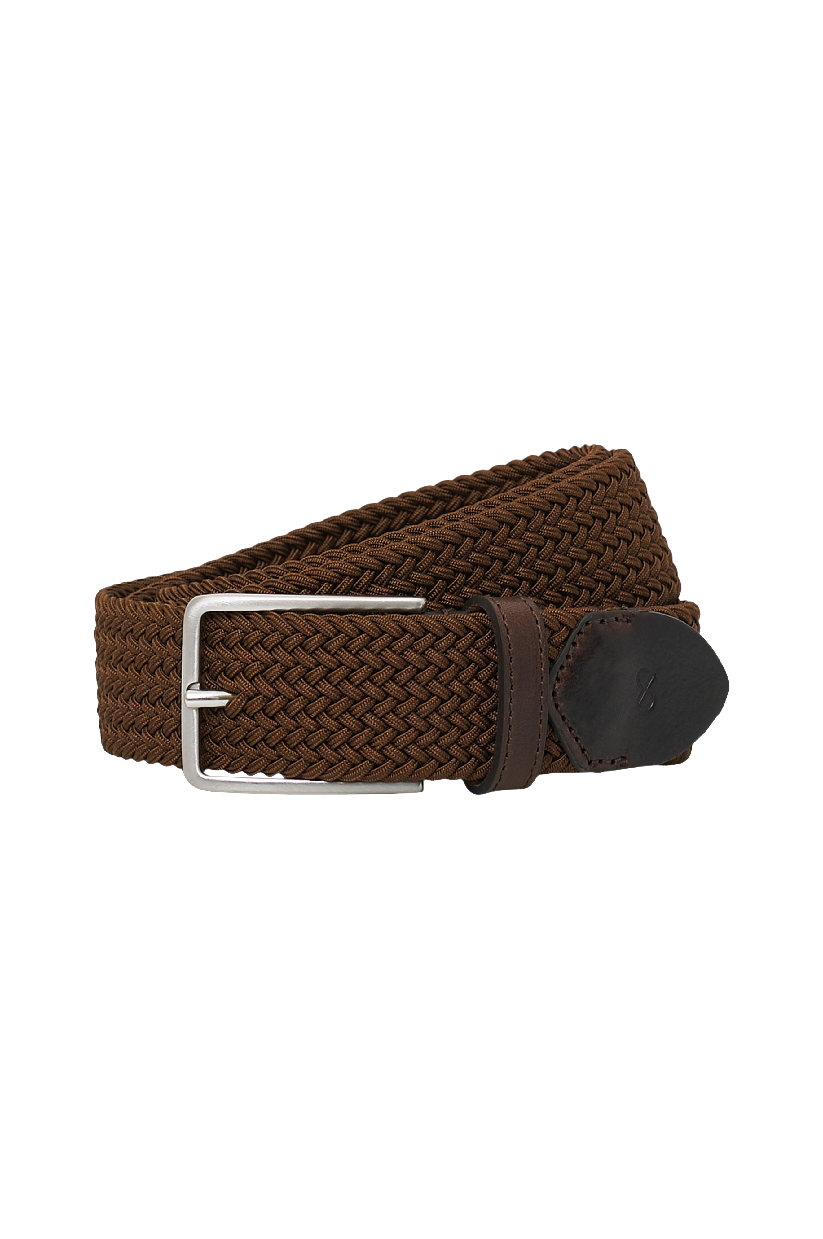 Elastiskt textilbälte i flätad design av hög kvalitet. Detaljer i skinn och spänne av matt, silverfärgad metall.