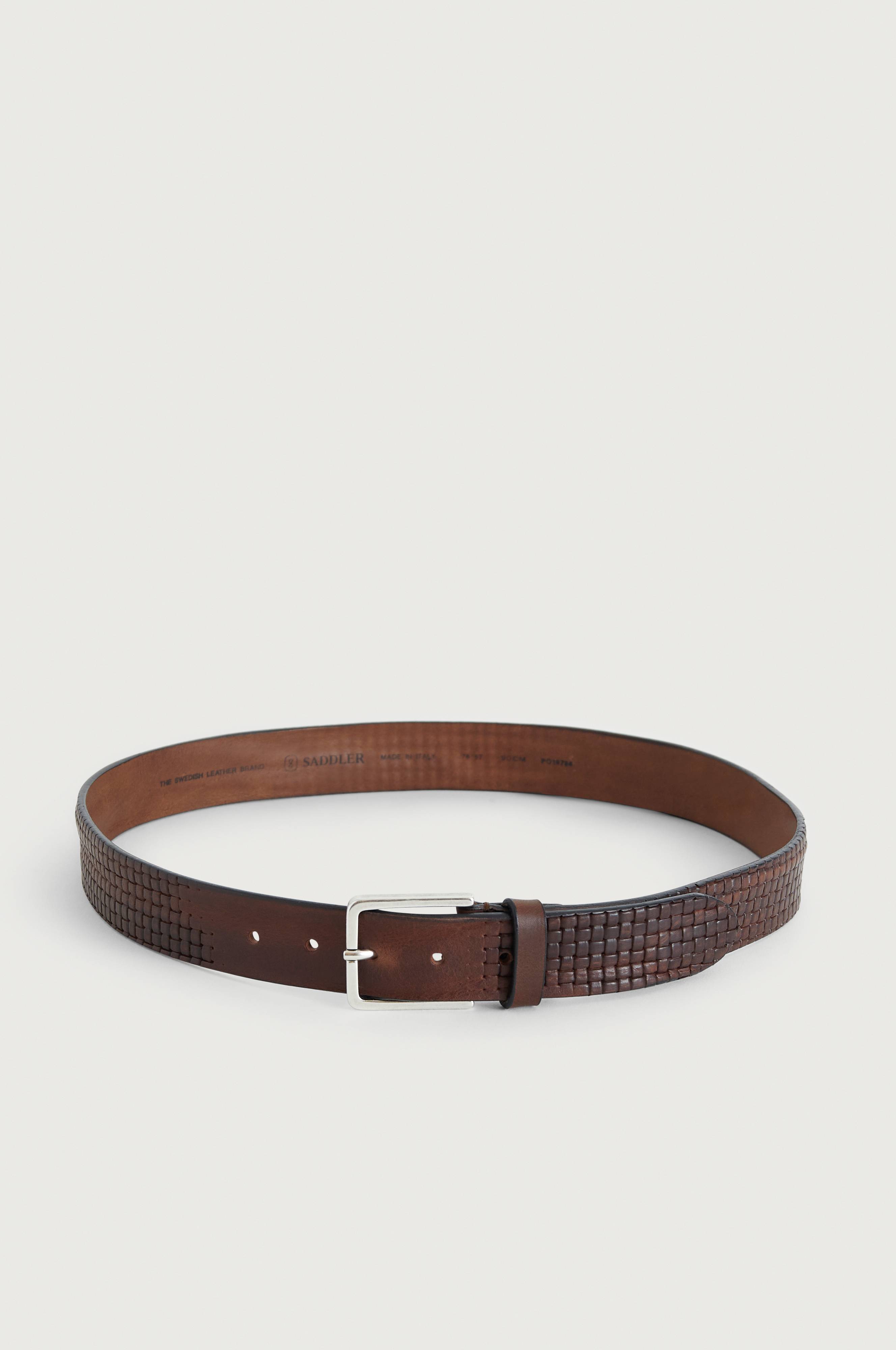 Bälte Olivier från Saddler. Modell i skinn med delvis präglar mönster och spänne i metall. Bredd ca 3,5 cm.