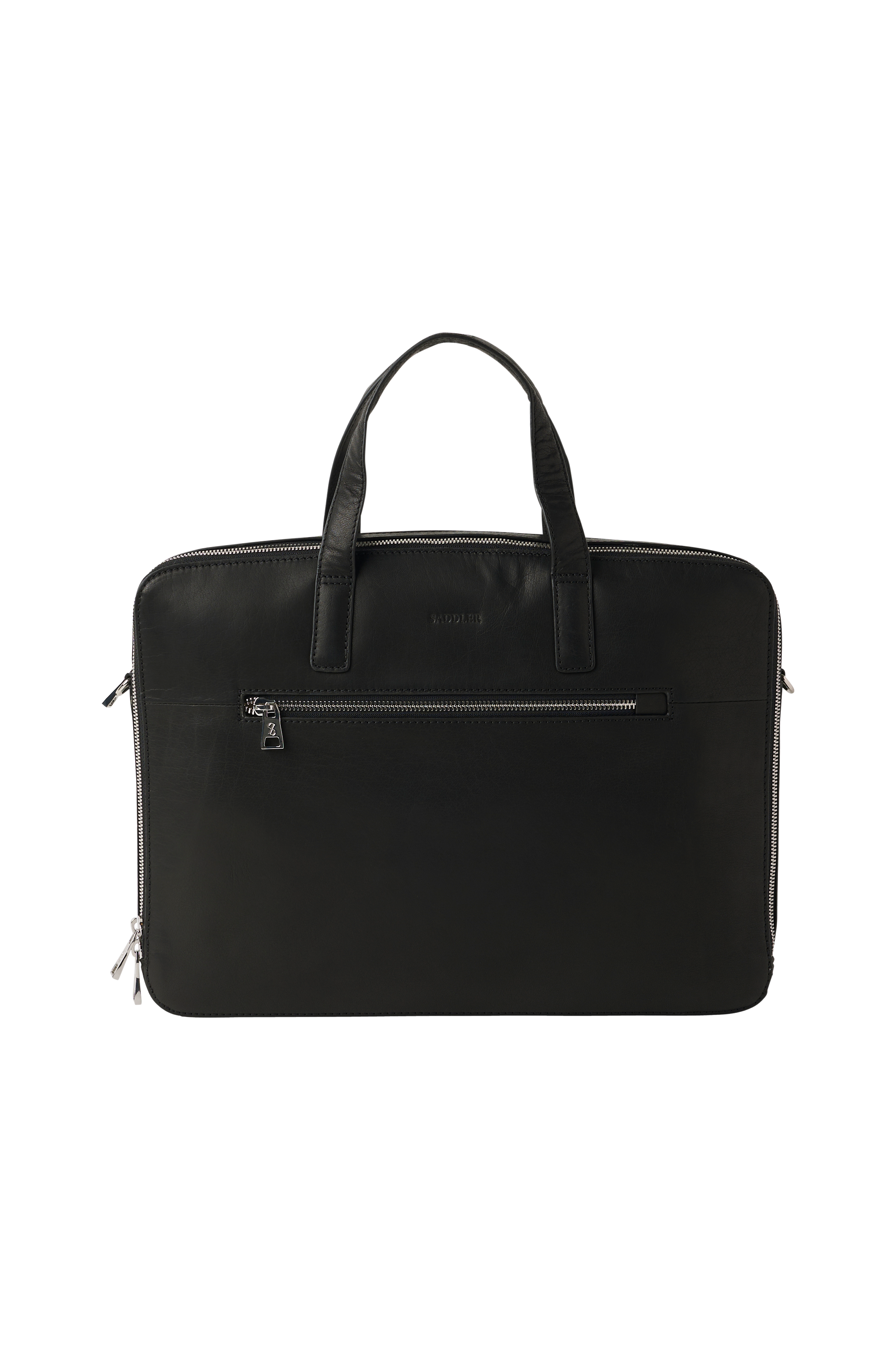 Datorväska i avskalad design, tillverkad i ett slätt full grain-buffelläder. Väskan har två fack varav det främre öppnas med en tvåvägsdragkedja i blank silverfärgad metall. Dragkedjan löper hela vägen ner till botten av väskan, vilket gör att facket kan öppnas helt och ge en tydlig överblick över dokument och dator. Facket är rymligt och har plats för en dator upp till 15”. Mot baksidan av väskan finns ytterligare ett vadderat fack med plats för en dator upp till 14”, facket försluts med dragkedja. Axelremmen är justerbar och avtagbar med en längd om max. 147 cm och min. 85 cm. Väskans mått: B38,5 x H38,5 x D 5 cm.