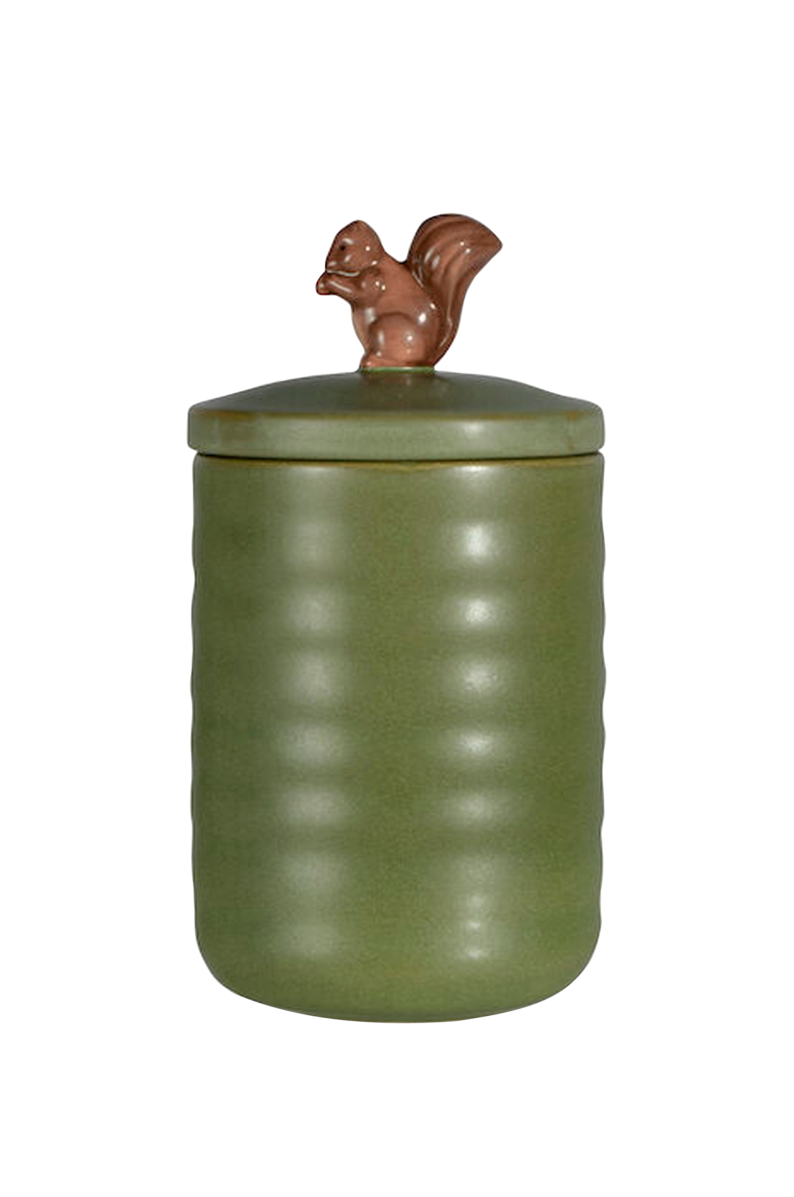 Burken Ellen är tillverkad i stengods och har en dekorativ ekorre på locket. Passar lika fint i köket som i badrummet.