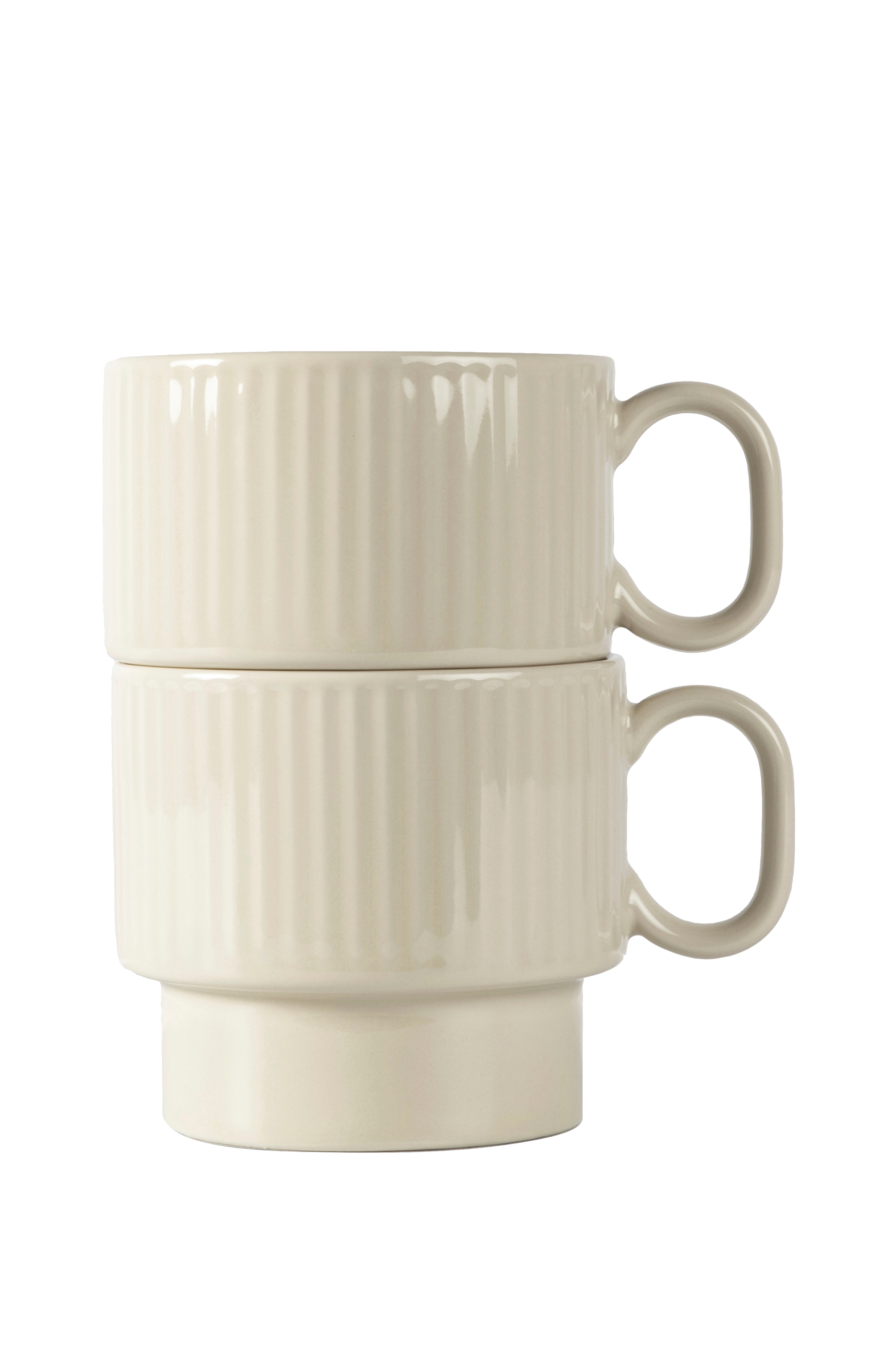 Ett set med två stapelbara tekoppar i stengods med en karaktäristisk relief i en vacker naturinspirerad färg. Den mjuka beige tonen passar perfekt med de andra färgerna i serien men sticker också ut på egen hand. Perfekt för din dagliga kopp te, med intrikata mönster och linjer som framkallar en känsla av hem och komfort. Muggarna ingår i serien Coffee & More, designad i samarbete med Margot Barolo för Sagaform. Tål maskindisk och livsmedel.