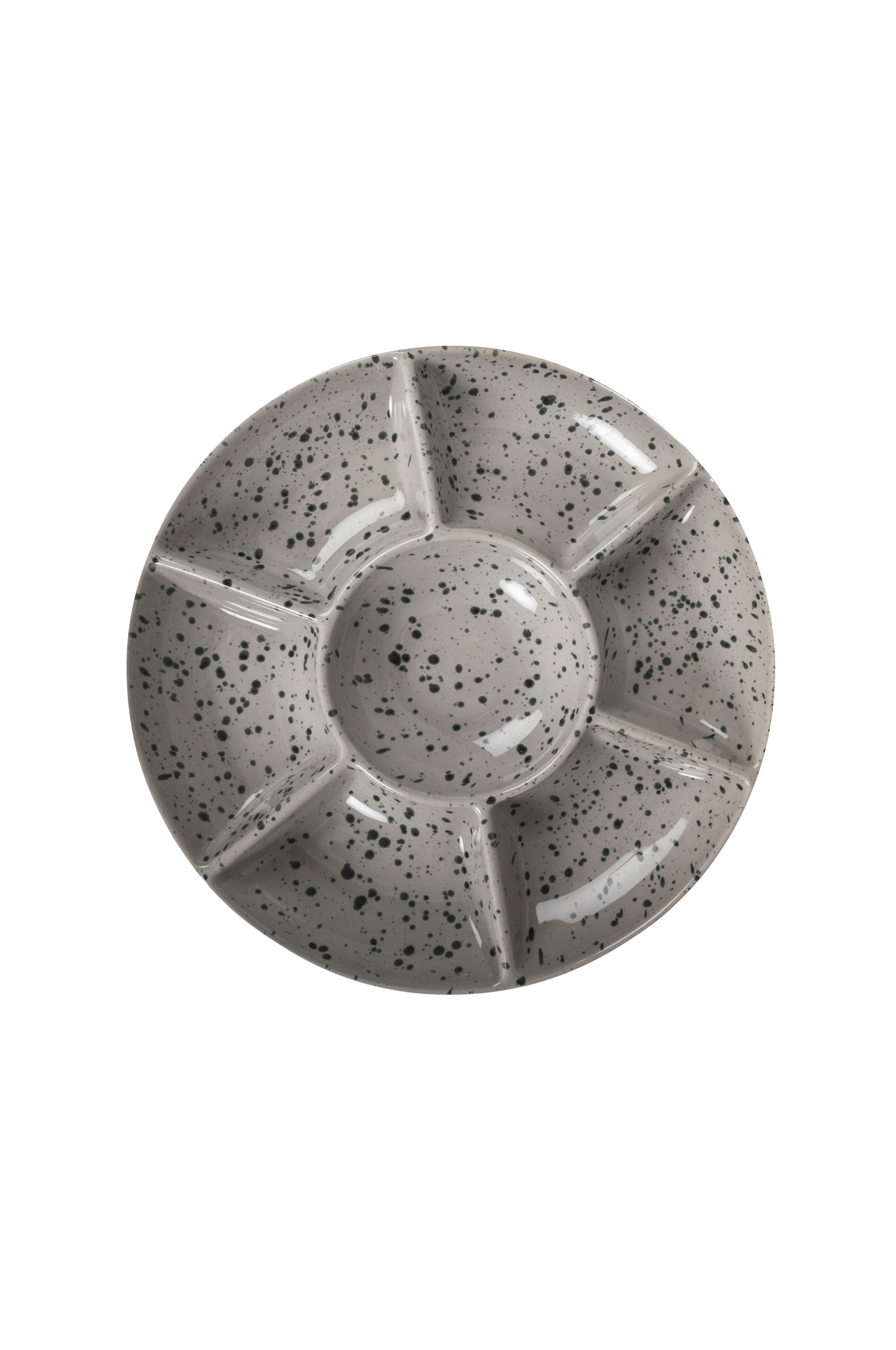 Ett handgjort serveringsfat med många användningsområden. Tapas, tacos eller plockmat – på Ditte serveringsfat får allt plats på samma tallrik. Dessutom sparar det plats på bordet och ger mindre disk. Stapelbart. Tillverkat av stengods i beige/grå toner med ett fint stänkmönster i svart. Mått: Diameter 26 cm, höjd 3,5 cm.