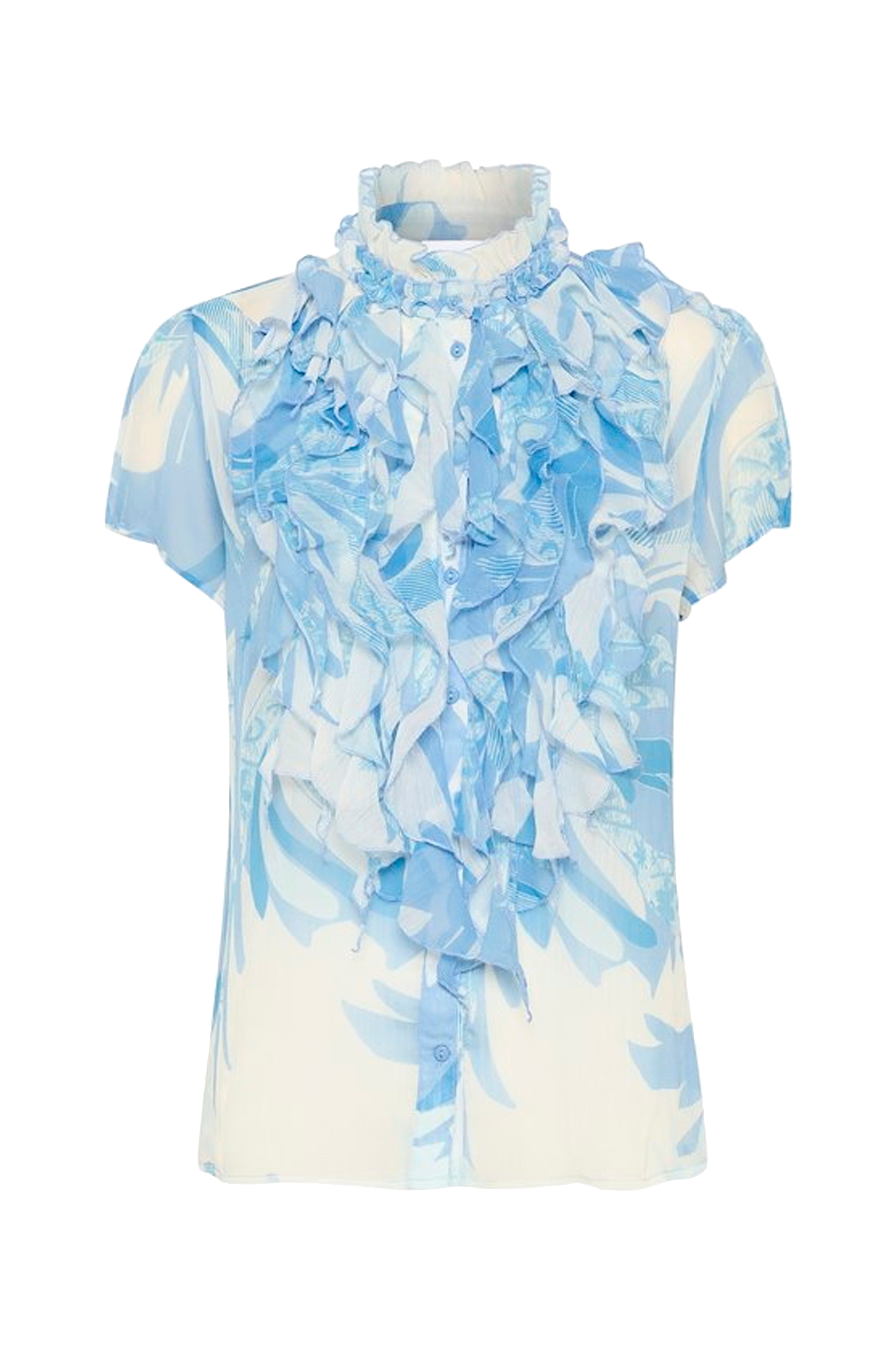 • Krås fram• Ståkrage med volang• Korta holkärmar• Knappar fram• Gjord av transparent chiffong