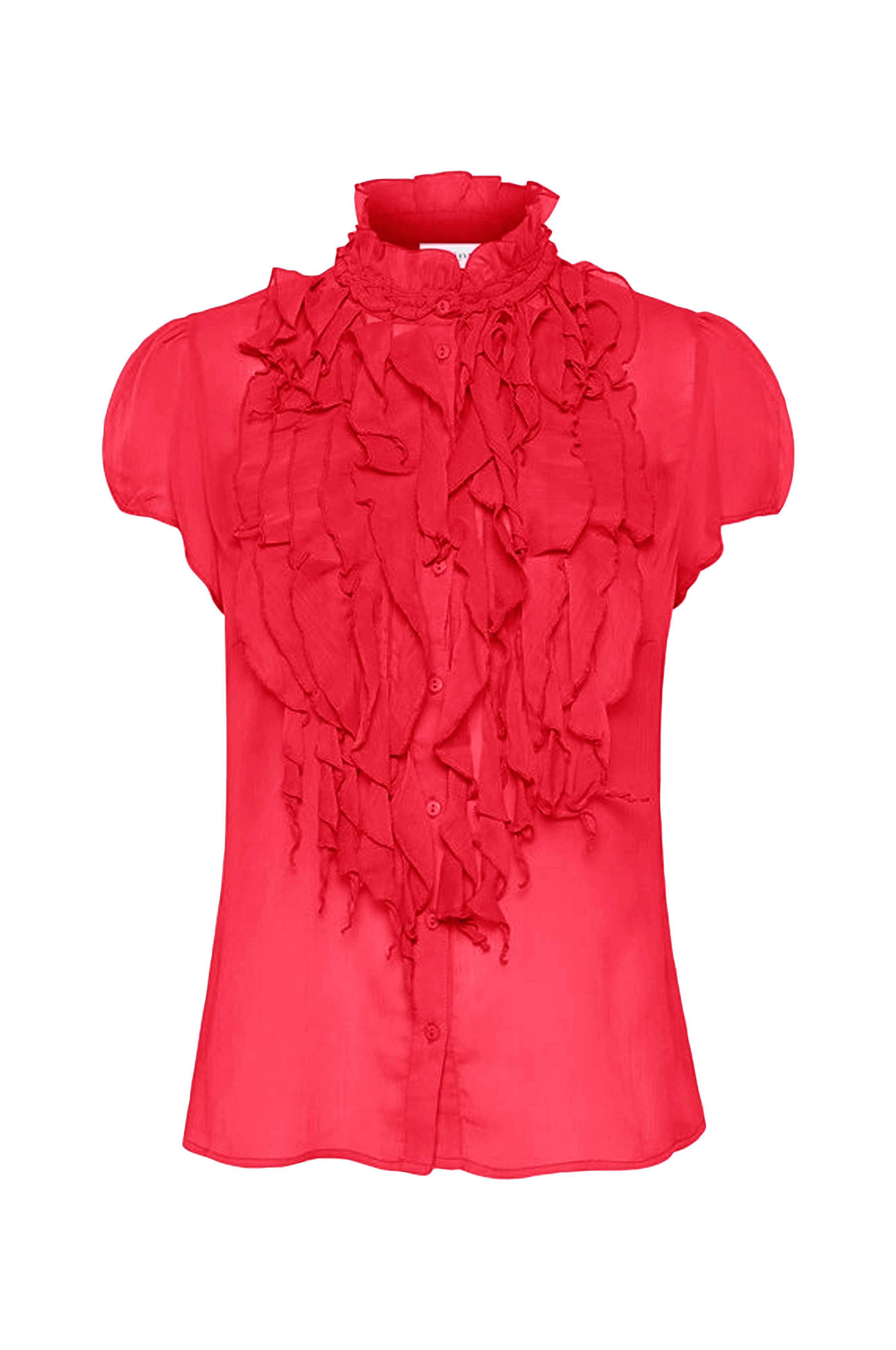 • Krås fram• Ståkrage med volang• Korta holkärmar• Knappar fram• Gjord av transparent chiffong