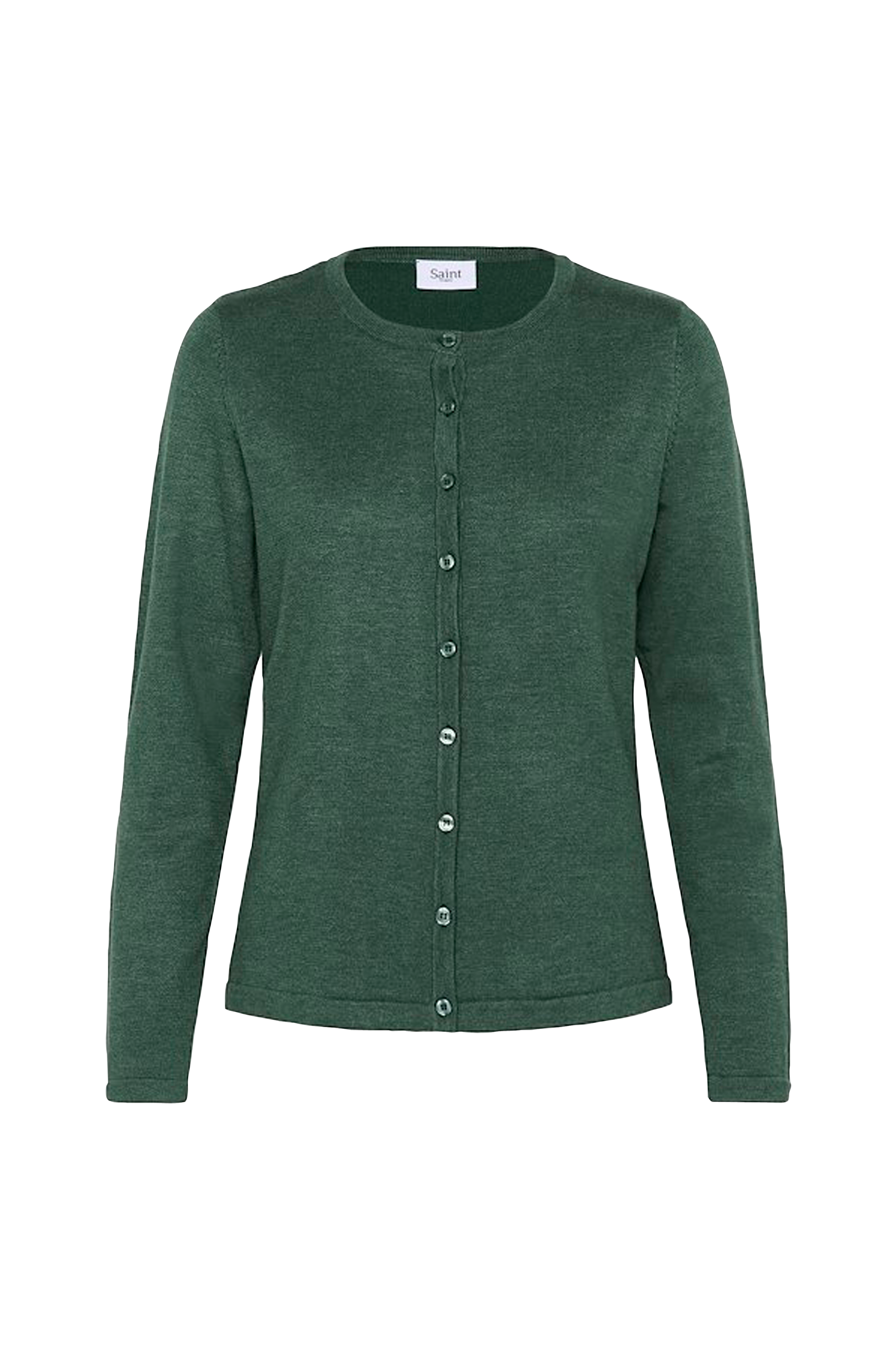 Cardigan från Saint Tropez i fin, slätstickad kvalitet. Lätt figurformad modell med rund hals och knäppning hela vägen fram. Smal ribbstickning i hals och knappslå. Längd ca 58 cm i stl M.