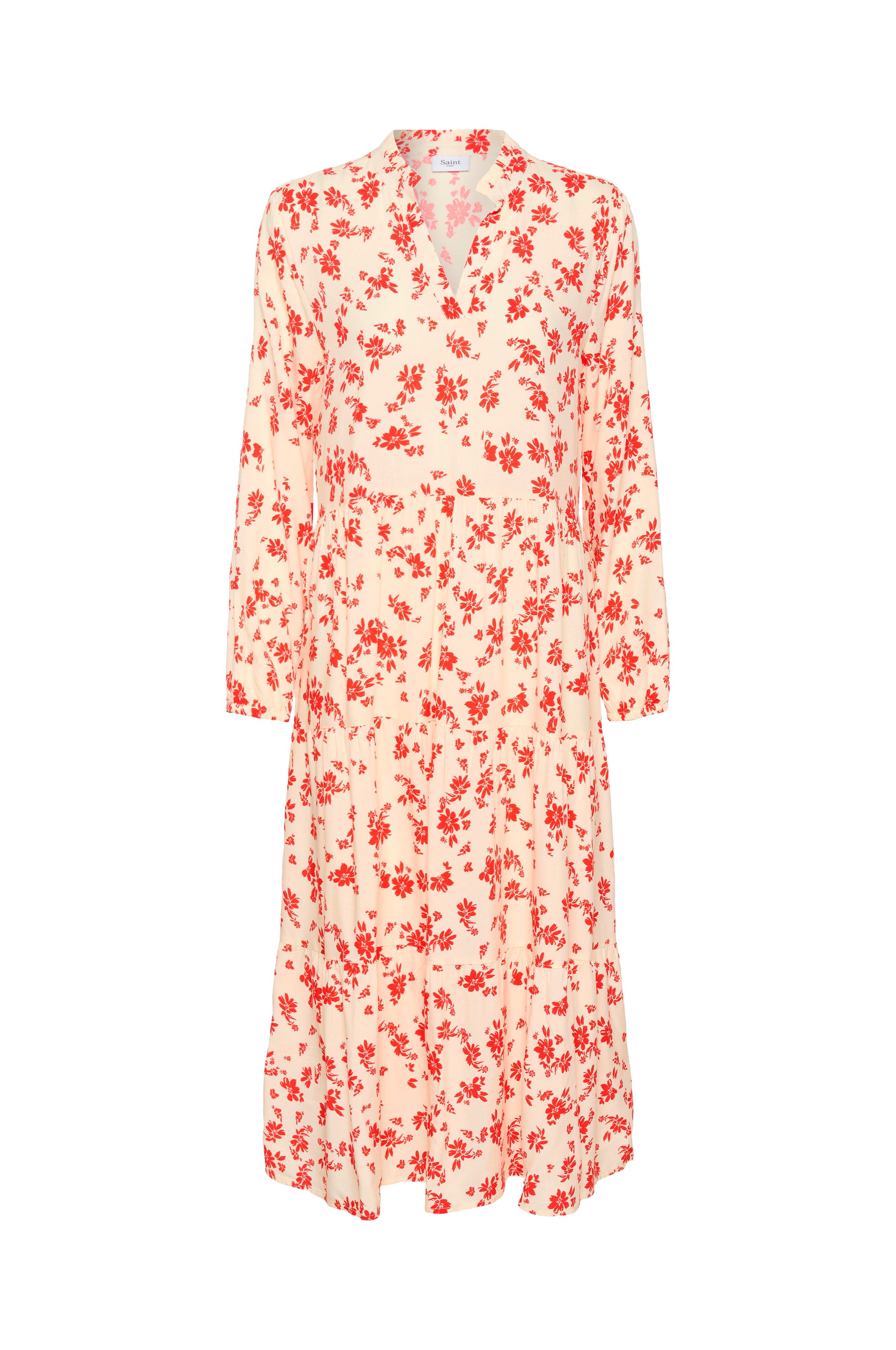 Klänning EdaSZ Maxi Dress från Saint Tropez. Modell med v-ringning fram och liten volangkant i halsen. Lång ärm med infälld resår i ärmslut och avskärning i midjan med vidd i kjolen och påsydd volang i nederkanten. Vävd kvalitet med mjukt fall. Längd ca 125 cm i stl S.