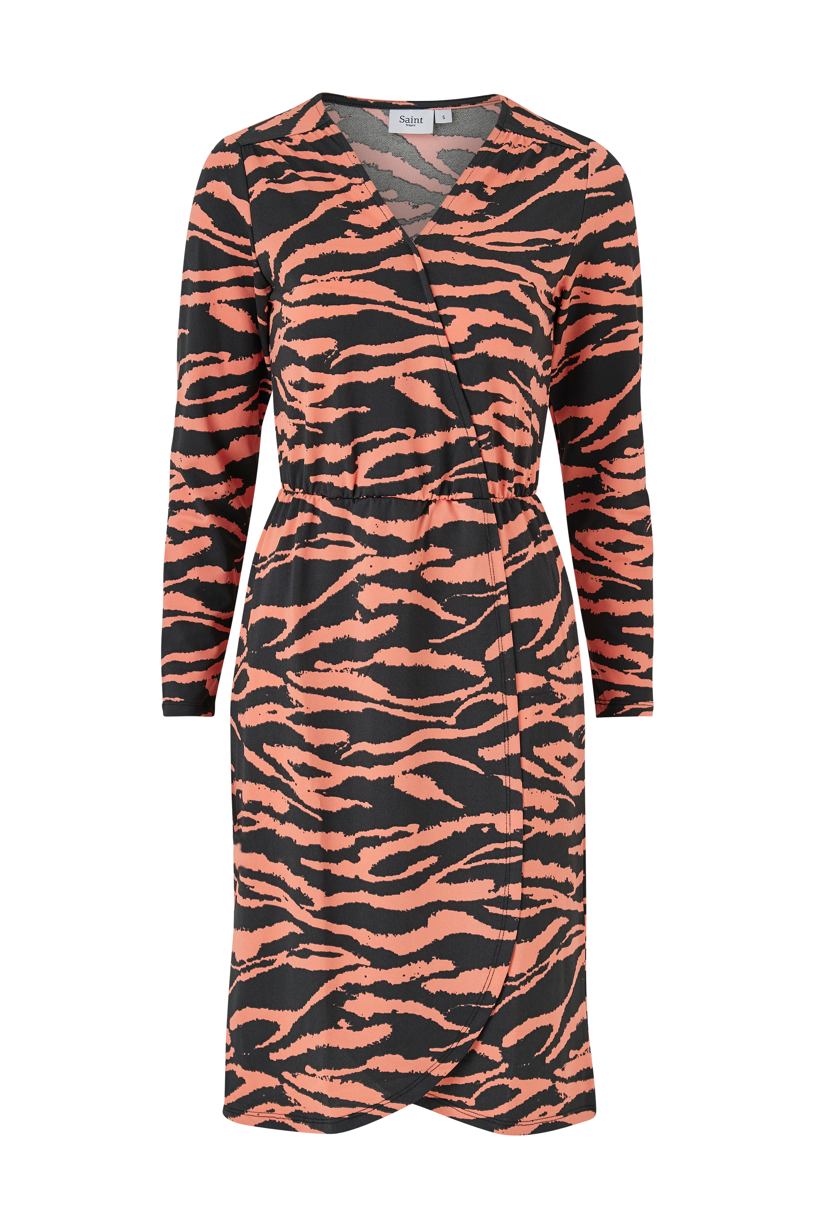 Klänning Tiger Jersey Wrap Dress från Saint Tropez. Snygg omlottmodell med avskärning och invändig resår i midjan samt rundskuren nederkant fram. Avskuret axelok med rynk framtill och lång ärm. Jerseykvalitet med stretch. Längd ca 105 cm i stl M.