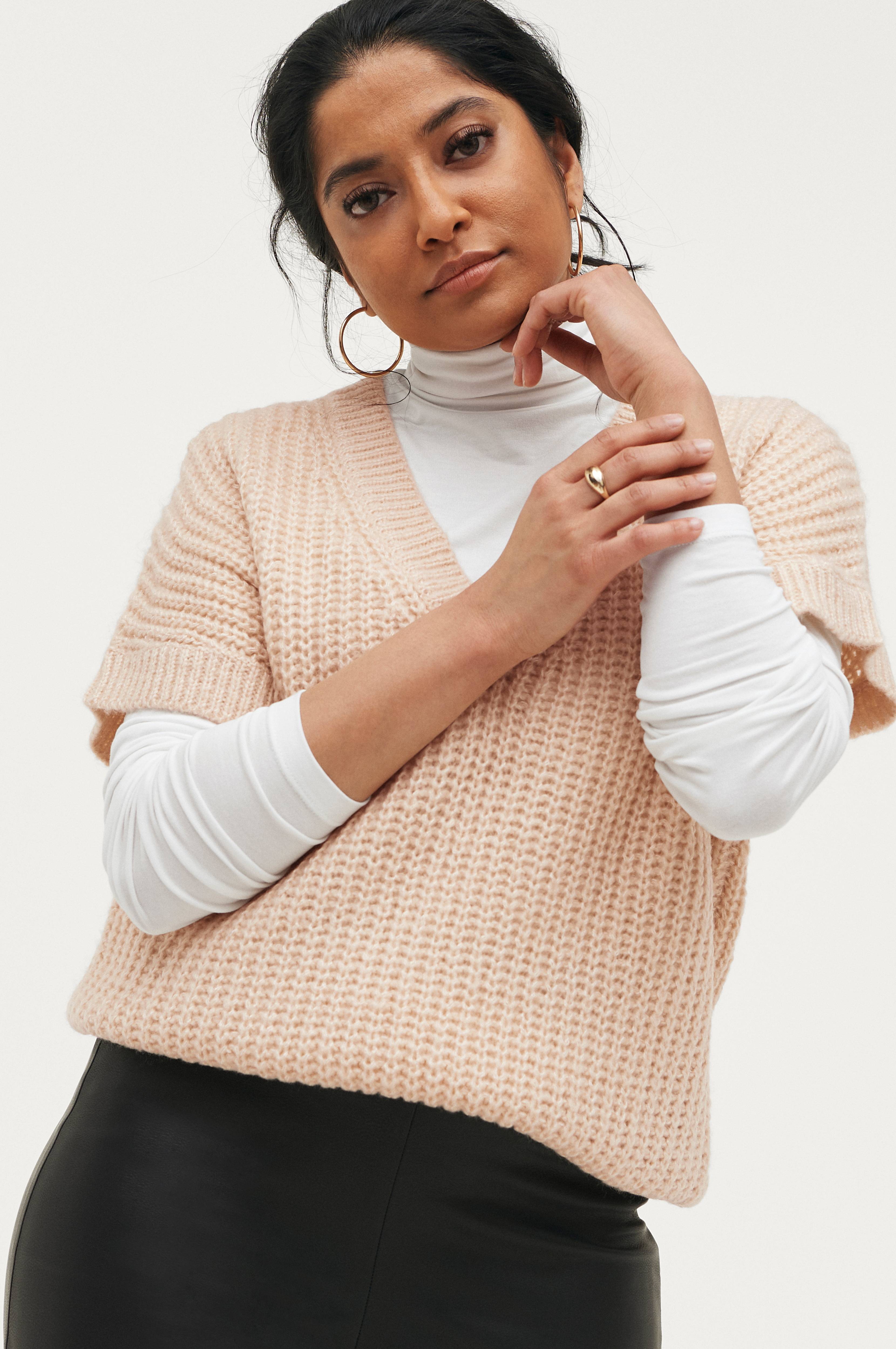 • Grovstickad modell med kort ärm• V-ringad, ribbad hals• Ribbad nederkant