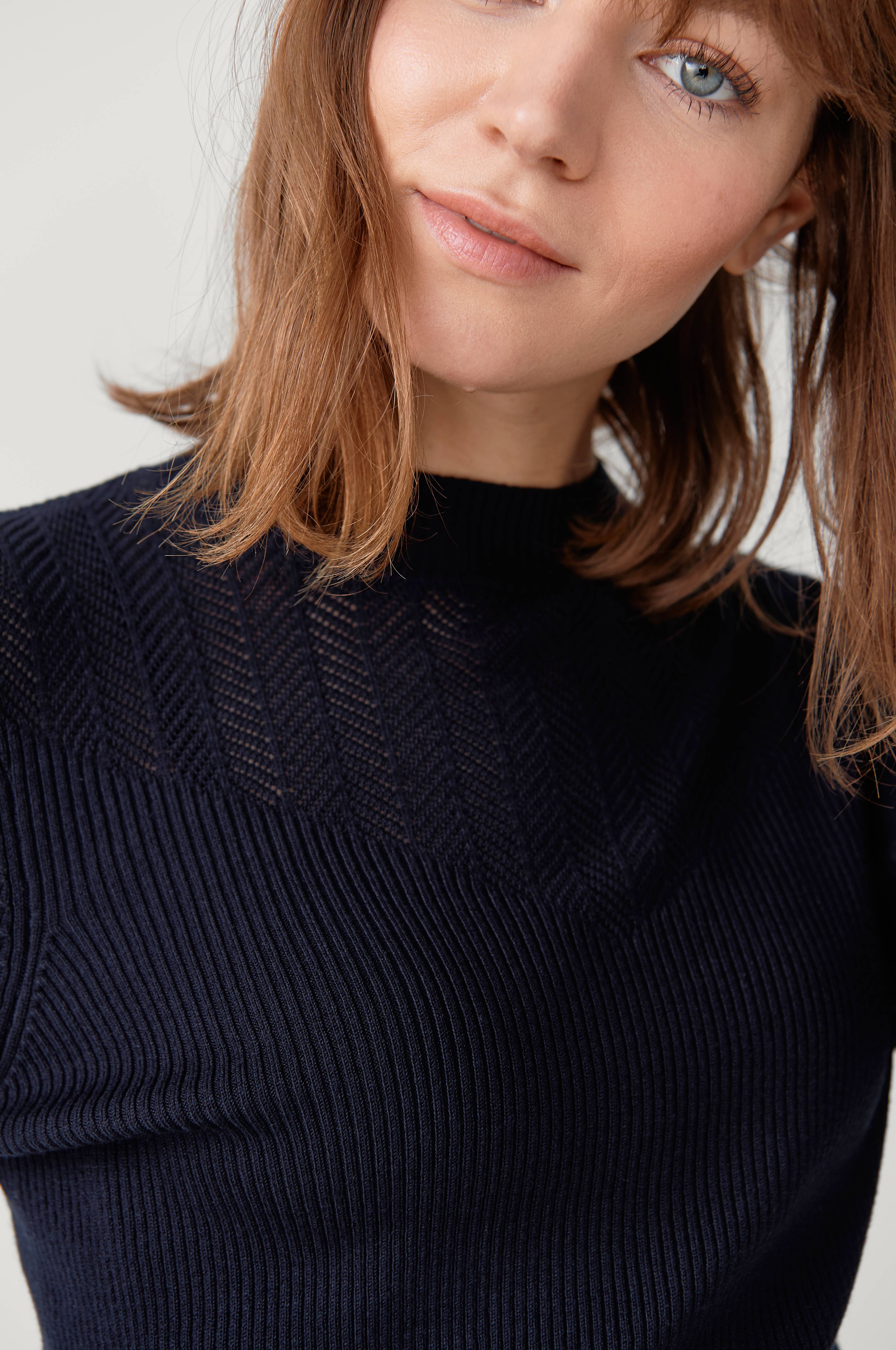 Tröja från Saint Tropez. Randstickad modell med mönsterstickning på bröstet och halvhög, ribbstickad krage.