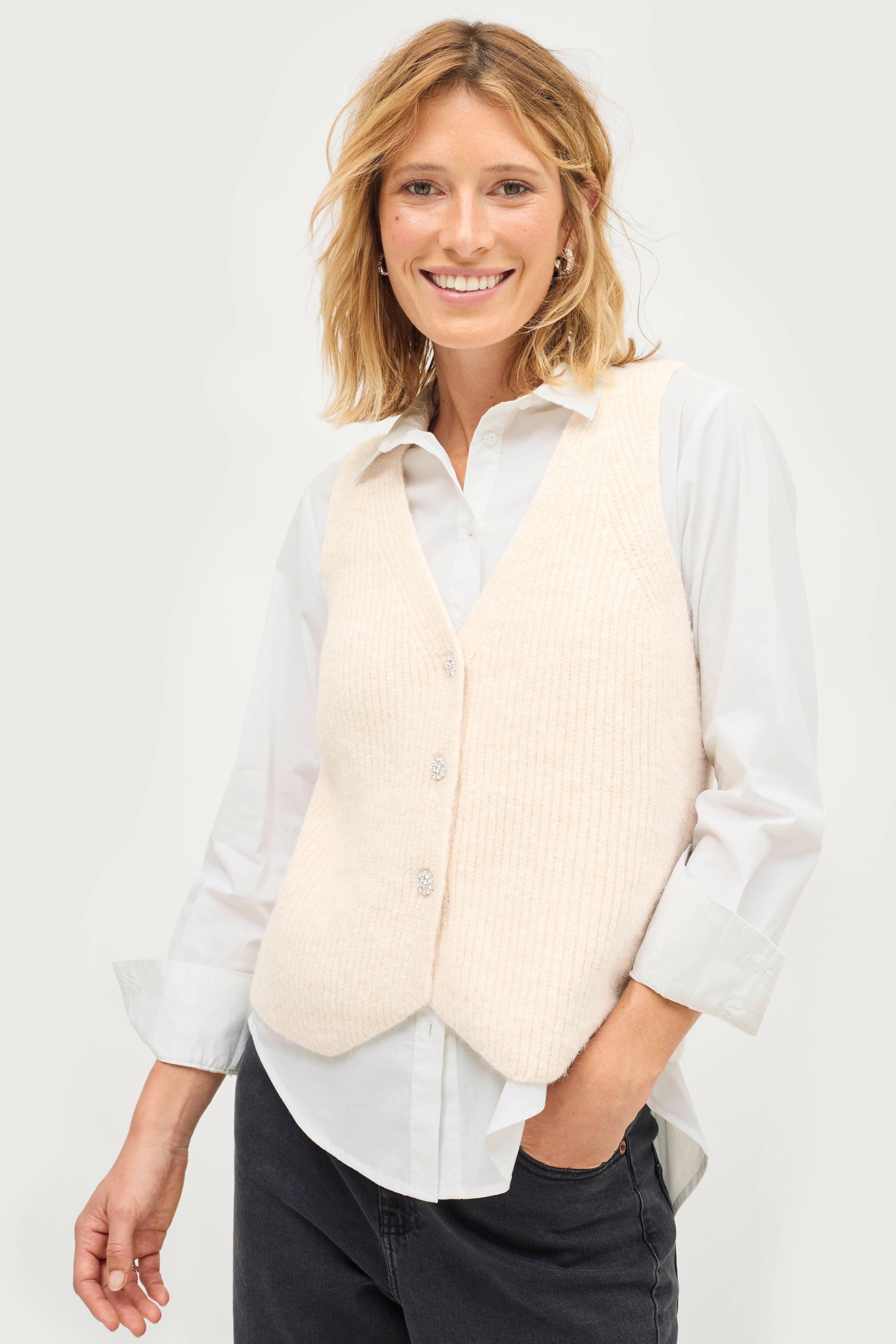 • Stickad väst• V-ringning• Knappar med strass