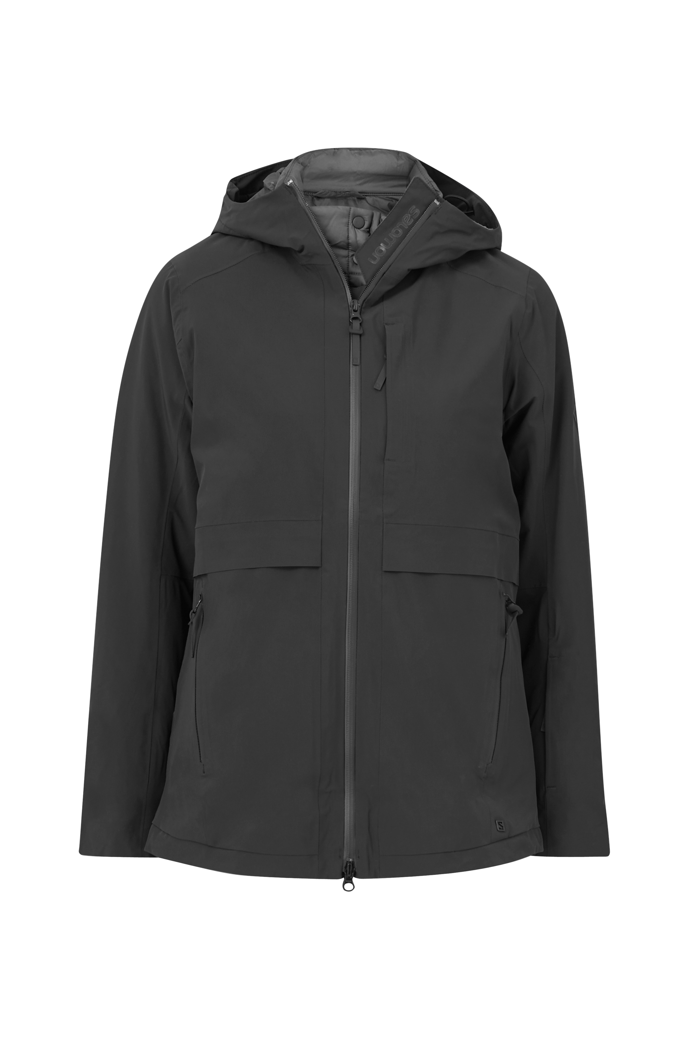 Fast, justerbar och hjälmkompatibel huva. Hög krage med mjuk, borstad trikå på insidan vid hakan. Stängning med dragkedja. Dragkedjor i ärmsluten. Två fickor nedtill med dragkedja och handvärmarfoder. En putsduk är fäst i vänster ficka. En bröstficka med skyddad dragkedja och en liftkortsficka på vänster ärm med dragkedja. En innerficka i mesh för skidglasögonen och en innerficka med dragkedja. Justerbar i midjan med dragsko bak. Längd ca 75 cm i stl S.