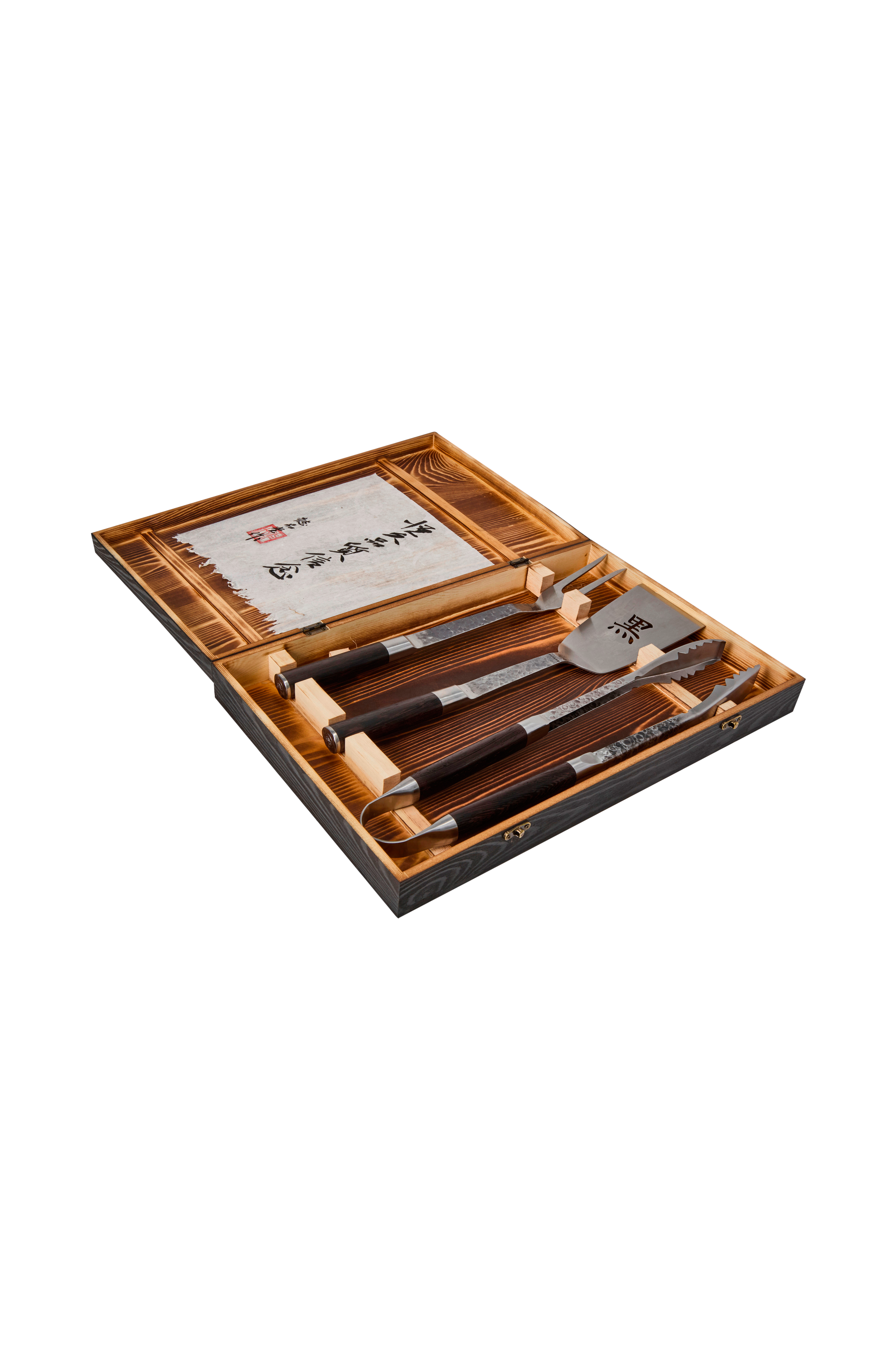 nu är det dags att ta grillningen till en helt ny nivå med det här exklusiva bbq setet i 3 delar från satake kuro. Setet innehåller tre förstklassiga grillverktyg som kombinerar funktion, hållbarhet och rustikhet. Setet innehåller en grilltång, en grillgaffel och en grillspatel, alla tillverkade av handhamrat stål med handtag i mörkt trä som utstrålar kvalitet och hantverkskunnande.