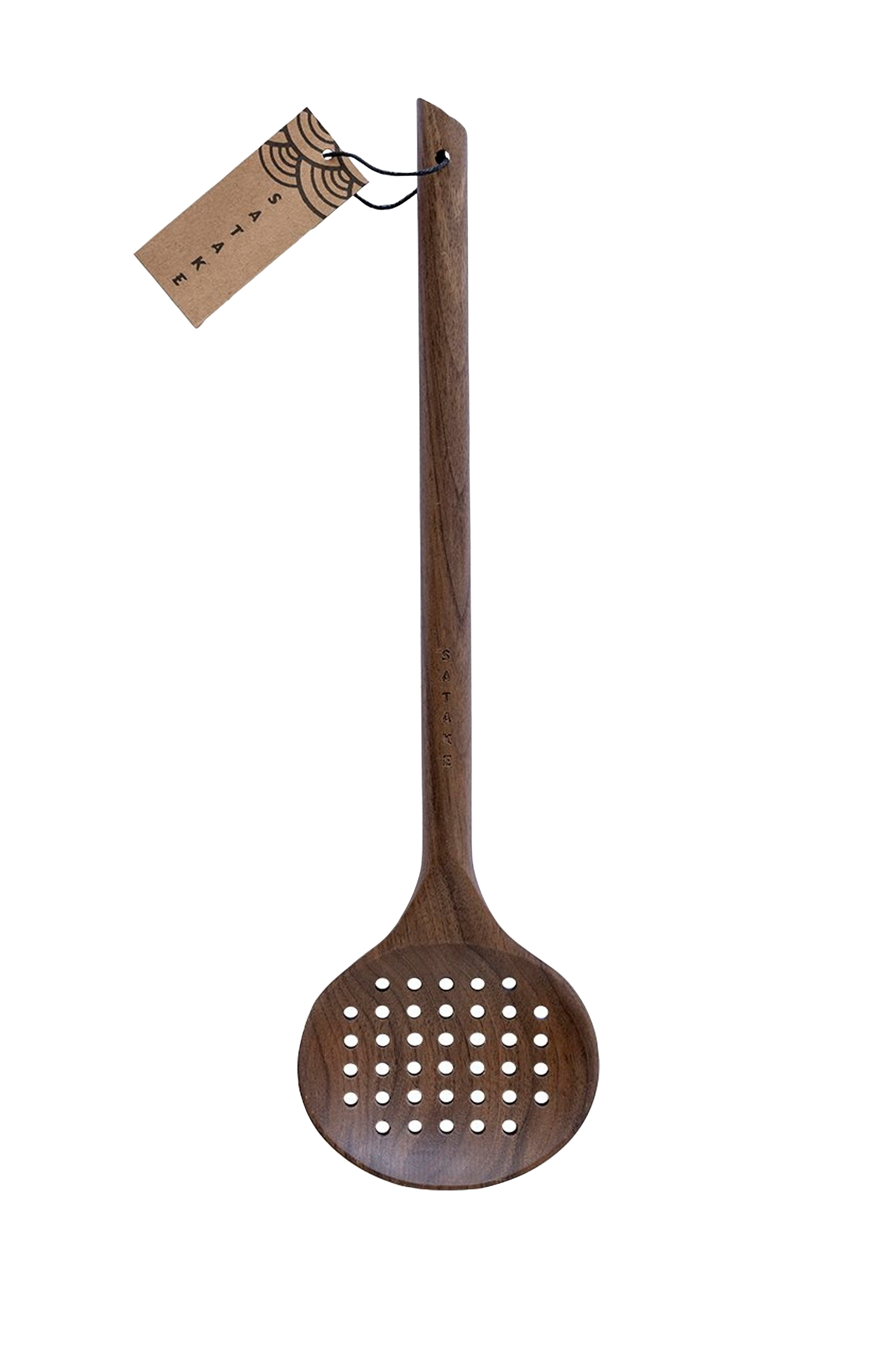 Det sägs att köksredskap är en förlängning av kockens själ, och aldrig har detta varit mer sant än med Satakes vackra serie av köksredskap. I den här kollektionen hittar vi en spatel, en hålsked, en spagettisked, en serveringssked och en rispaddel/rissked, alla tillverkade i mörk, elegant valnöt. Varje verktyg är utformat med omsorg och precision. just den här slitsade skeden gör stor nytta när du lyfter upp känsliga grönsaker eller pasta ur kokvattnet. Långt skaft av mjuk polerad valnöt med diskret satake-logotyp. andra verktyg i samma serie är; spateln som är som en pålitlig vän vid din sida när du vänder och hanterar kött, fisk och grönsaker. Spaghettisleven, med sin genomtänkta design, gör att du kan servera pasta utan spill, och serveringsskeden hjälper dig att presentera dina kulinariska mästerverk med elegans. Rispaddeln är särskilt omtyckt för sin förmåga att servera ris fluffigt och perfekt, men den är också mycket användbar när det gäller att blanda sallader, till exempel.