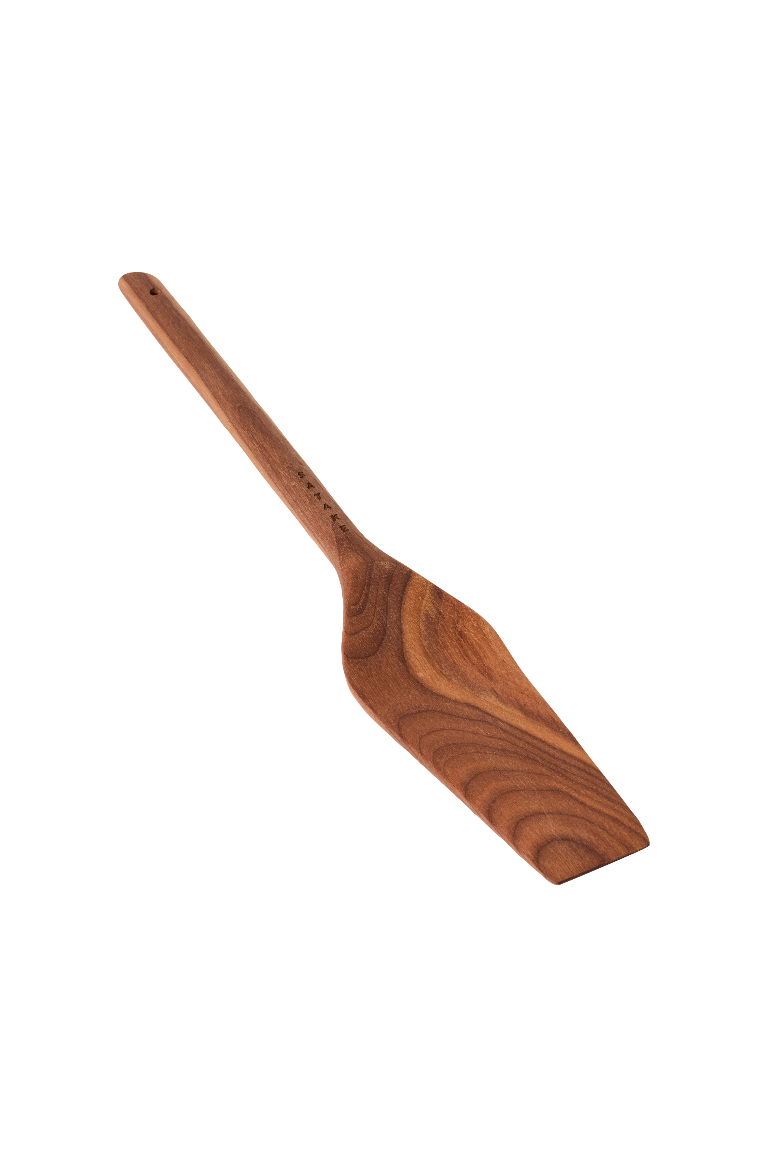 just den här eleganta spateln i valnöt är ett mångsidigt verktyg för dem som uppskattar hantverk och känsla i köket. Med sin mjuka form fungerar den lika bra som en palett för temperering och hantering av choklad, som en delikat stekspade för att vända t.ex. fisk eller små pannkakor.