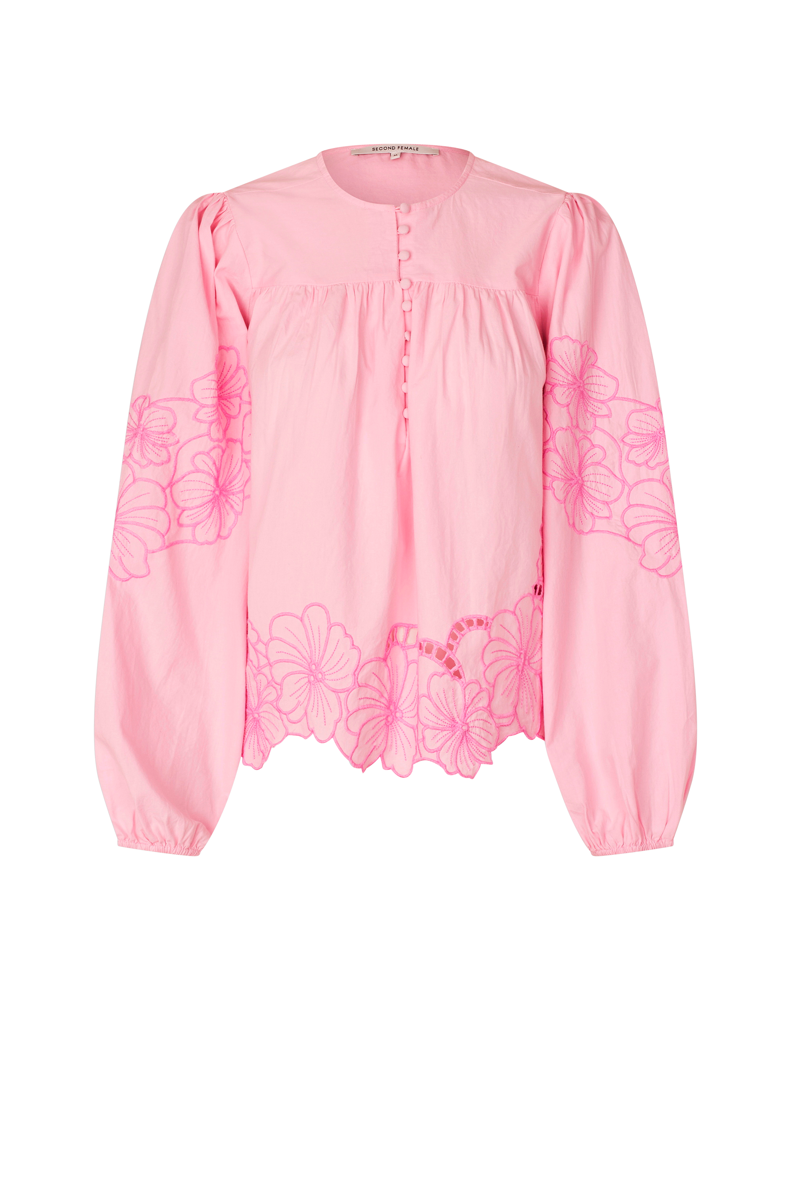 • Blus i bomull• Rund halsringning• Långa ballongärmar• Kort knappslå• Broderade detaljer• Vågig nederkant
